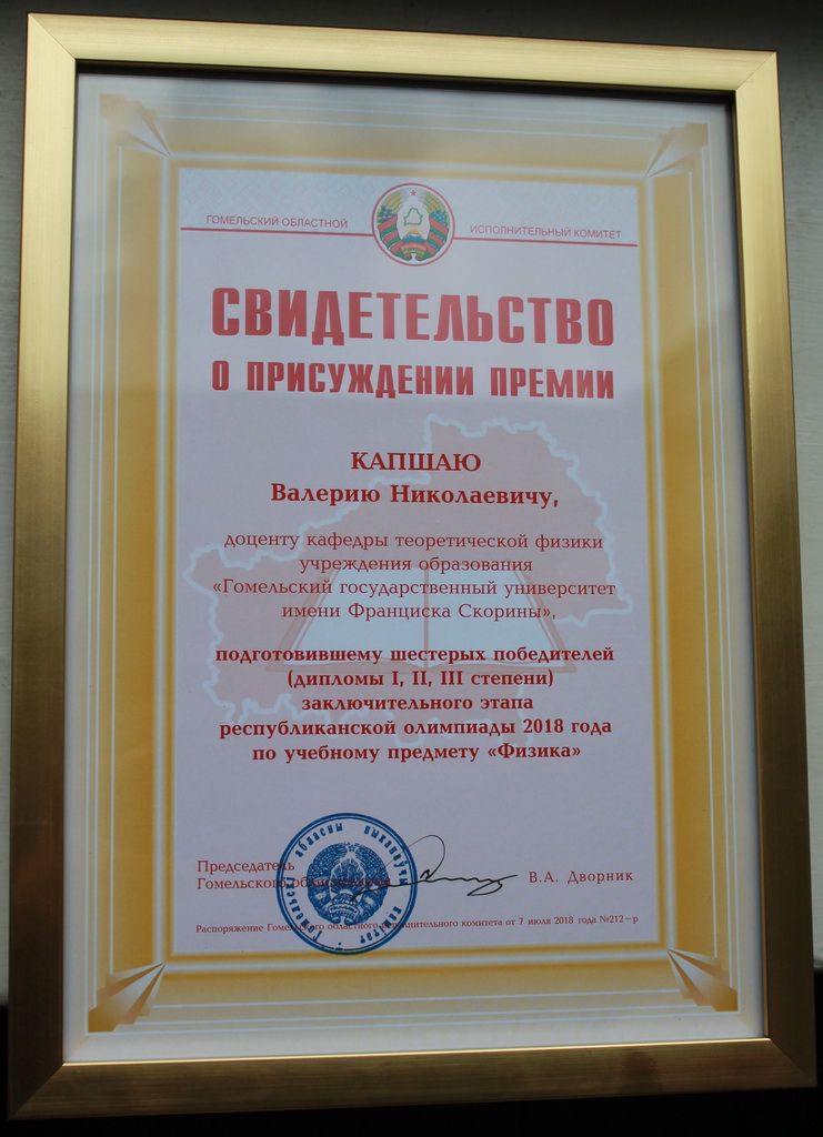 Помимо обсуждения развития и совершенствования региональной системы образования на совещании состоялась церемония награждения лучших представителей педагогической общественности. За подготовку победителей заключительного этапа республиканской олимпиады премией облисполкома награжден доцент кафедры теоретической физики ГГУ имени Ф. Скорины Валерий Капшай.