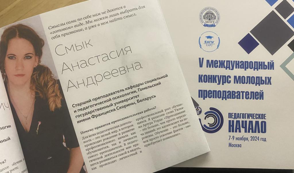 С 7 по 9 ноября 2024 года в г. Москва на базе Московского педагогического государственного университета прошел финал международного конкурса молодых преподавателей системы непрерывного педагогического образования государств-участников СНГ «Педагогическое начало – 2024». Общее количество конкурсантов из педагогических вузов и учреждений дополнительного профессионального образования Содружества независимых государств составило более 100 человек, в финале приняли участие 23 преподавателя. Наш университет в финале конкурса достойно представила Анастасия Смык, старший преподаватель кафедры социальной и педагогической психологии.