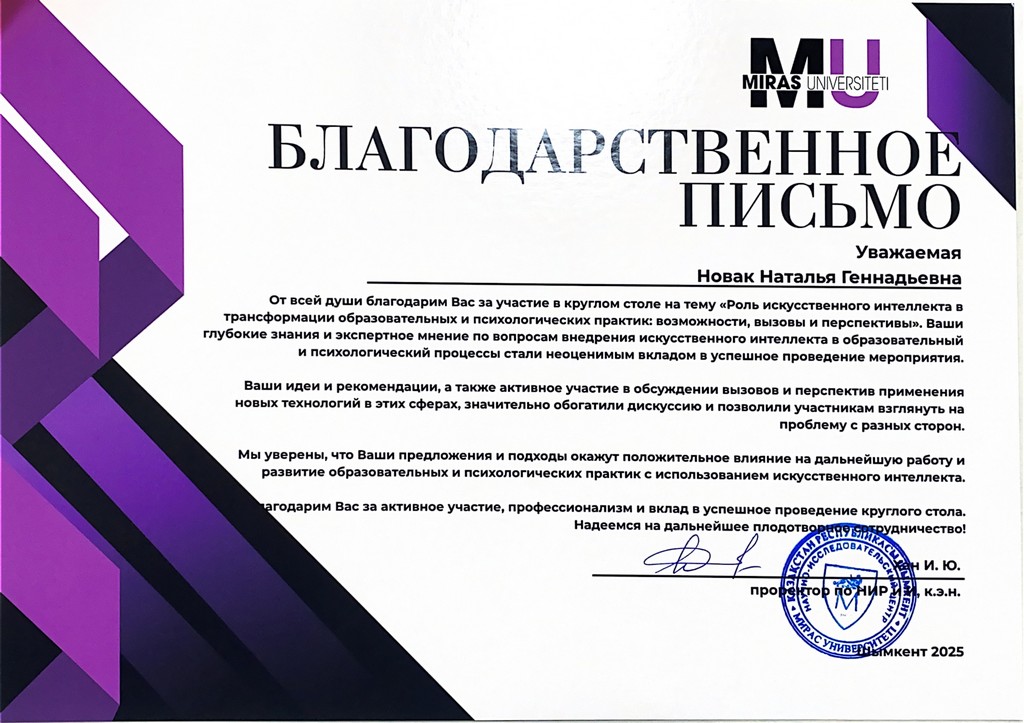 Доцент кафедры социальной и педагогической психологии Наталья Новак приняла участие в Круглом столе «Роль искусственного интеллекта в трансформации образовательных и психологических практик: возможности, вызовы и перспективы», проходившем на базе Центрально-Азиатского университета (15 апреля, Республика Казахстан, Шымкент). Преподаватель нашего университета выступила с темой «Психологическое сопровождение студентов в сложных жизненных ситуациях». Руководство университета выразило благодарность Наталье Геннадьевне за представленный опыт, а также подчеркнуло важность многолетнего сотрудничества учреждений образований.