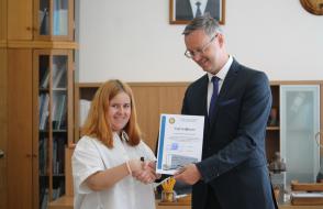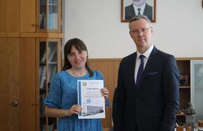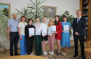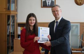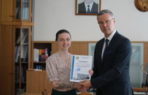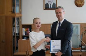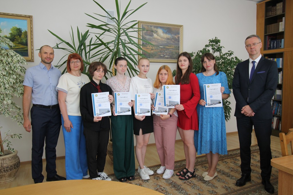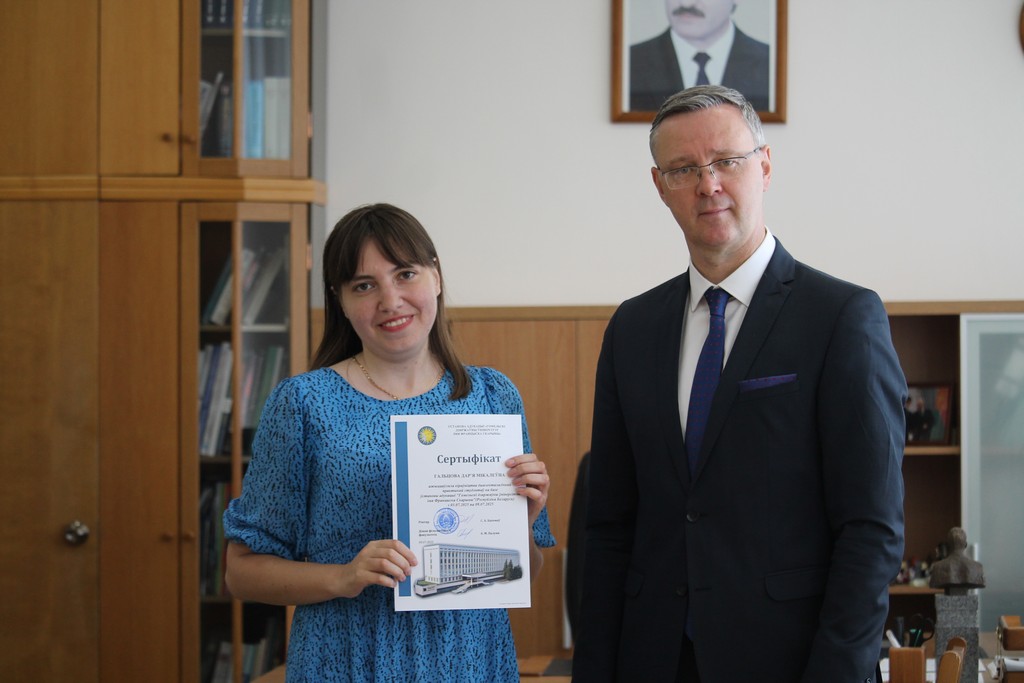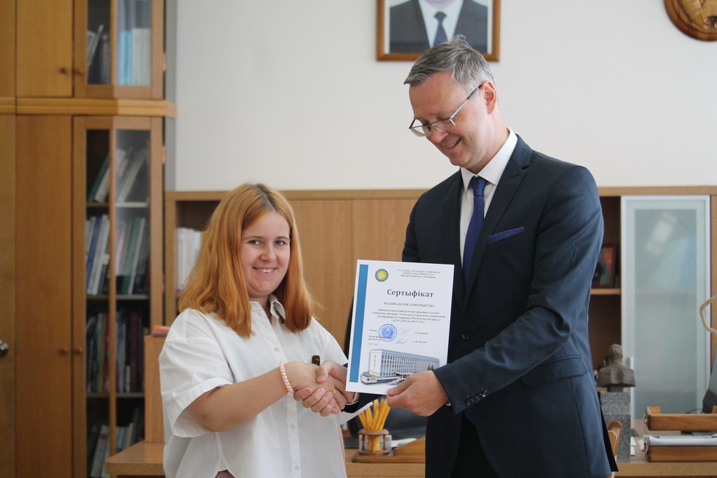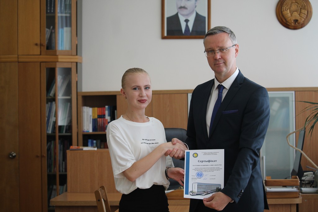 Рэктар урычыў студэнтам і выкладчыку сертыфікаты аб праходжанні вучэбнай практыкі на базе ГДУ імя Францыска Скарыны.