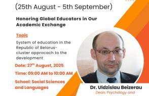 27 августа декан факультета психологии и педагогики ГГУ имени Ф. Скорины Владислав Бейзеров по приглашению индийской стороны принял участие в качестве спикера в Глобальной неделе академических обменов. В онлайн-формате для студентов, магистрантов, аспирантов и преподавателей университета LPU (Пенджаб, Индия) была прочитана лекция на тему «Система образования Республики Беларусь: кластерный подход к развитию». В ходе лекции спикер рассказал о преимуществах системы образования Республики Беларусь, возможностях получения образования на разных ступенях в учреждениях образования нашей страны. Лекция вызвала большой интерес со стороны аудитории.