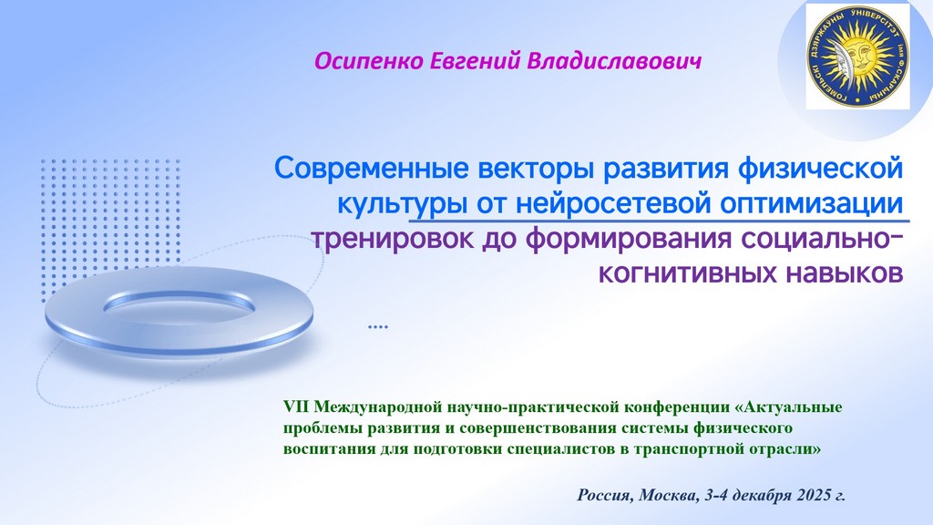 На конференции в Москве с приветственными речами к участникам обратились член-корреспондент РАН, доктор технических наук, профессор Игорь Розенберг и директор Академии бизнеса и права, доктор политических наук, профессор Александр Горбунов. С пленарным докладом «Современные векторы развития физической культуры: от нейросетевой оптимизации тренировок до формирования социально-когнитивных навыков» выступил заведующий кафедрой ТМФК Евгений Осипенко.