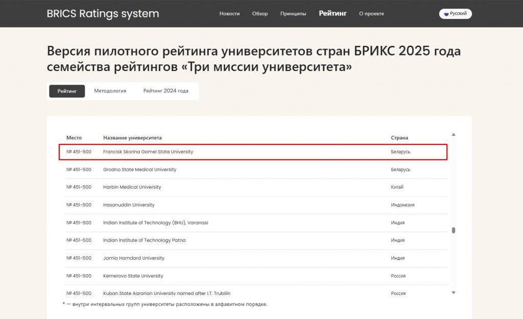 Включение в рейтинг БРИКС закрепляет статус Гомельского государственного университета имени Ф. Скорины как одного из ведущих региональных университетов Беларуси и безусловного лидера Гомельского региона, демонстрирующего конкурентоспособность на фоне крупных национальных и зарубежных образовательных центров.