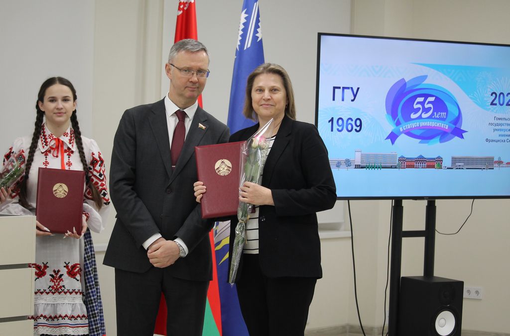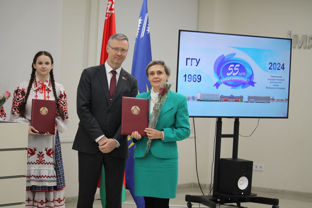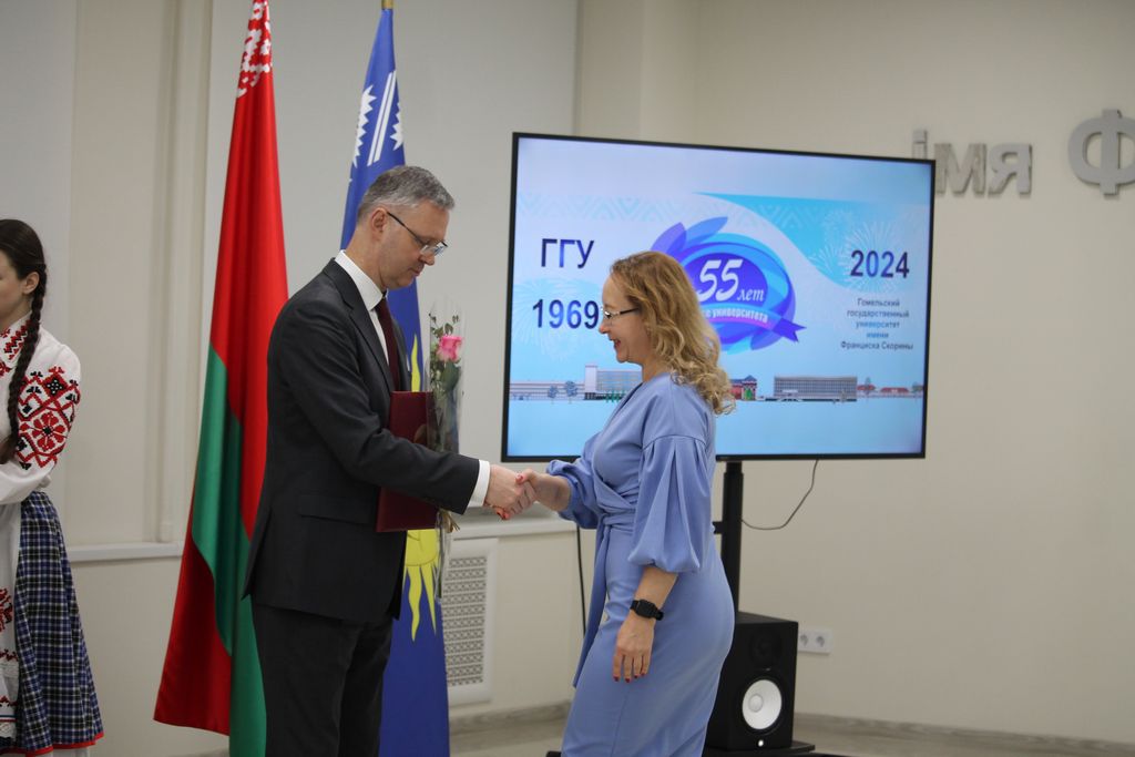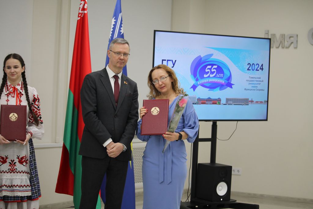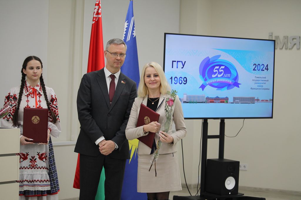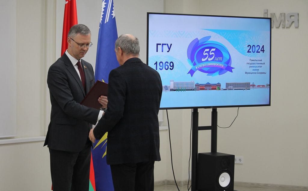В Гомельском государственном университете имени Франциска Скорины прошло торжественное заседание совета университета, приуроченное к 55-летию со дня преобразования Гомельского государственного педагогического института имени В.П. Чкалова в Гомельский государственный университет. В ходе заседания состоялось торжественное вручение наград в связи с 55-летием со дня преобразования института в университет.  Студентам и преподавателям университета были вручены свидетельства специального фонда Президента Республики Беларусь по социальной поддержке одаренных учащихся и студентов. Информация о стажировках профессорско-преподавательского состава в 2024 году была представлена проректором по учебной работе Ю.В. Никитюком. Также была обсуждена тема представления кандидатур студентов на назначение премий председателей Гомельского облисполкома и горисполкома. В завершение заседания, декан геолого-географического факультета Светлана Андрушко представила информацию об открытии на факультете новой специальности «Туризм и гостеприимство» (квалификация – специалист).