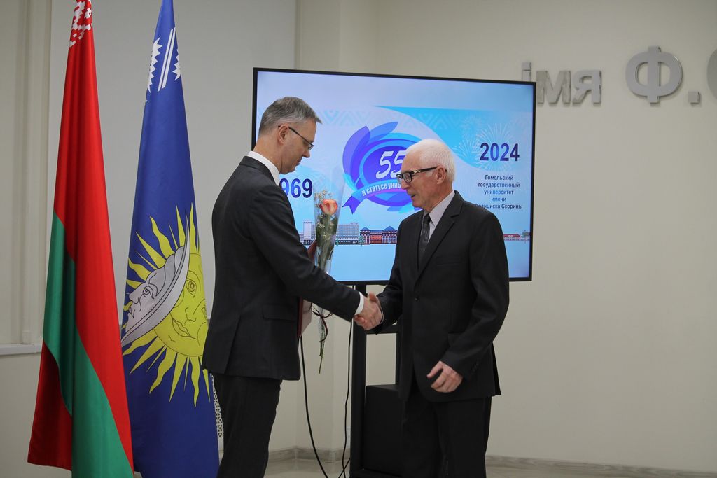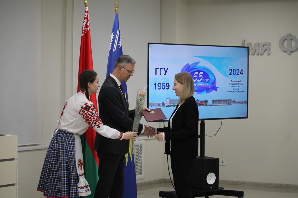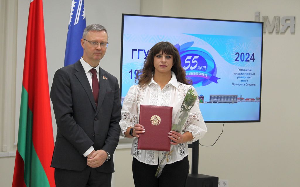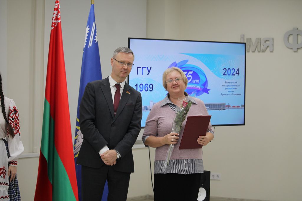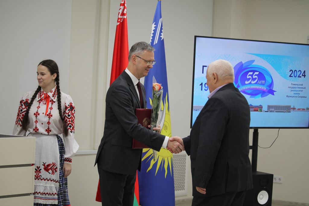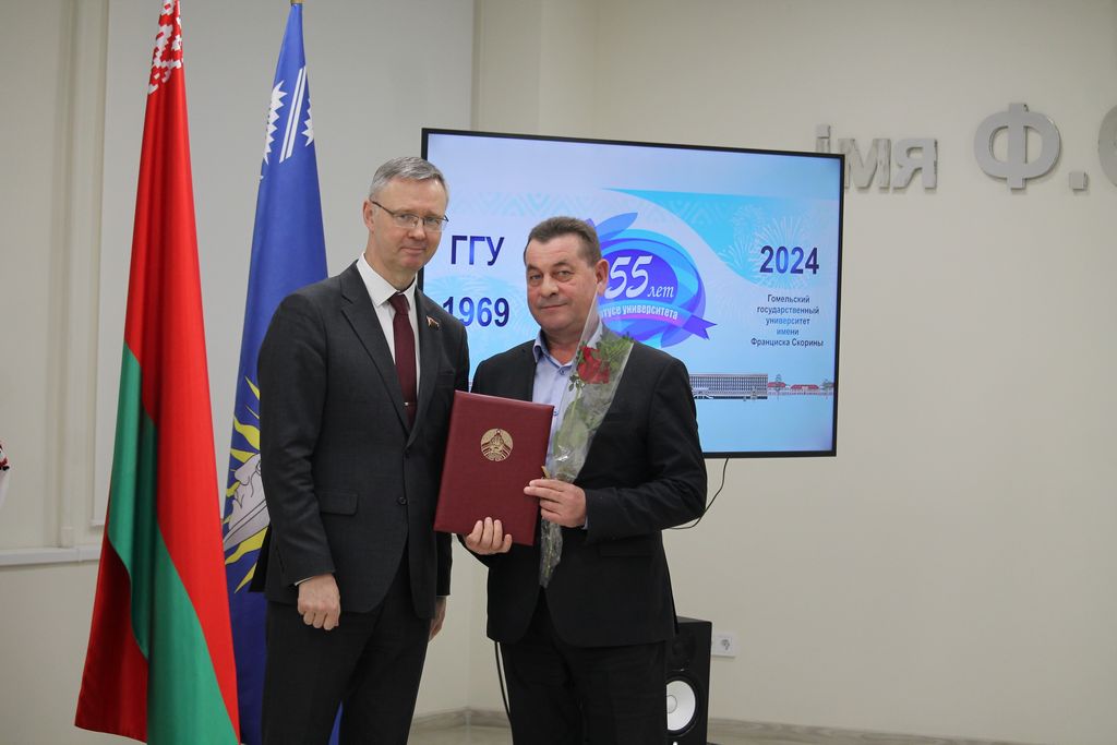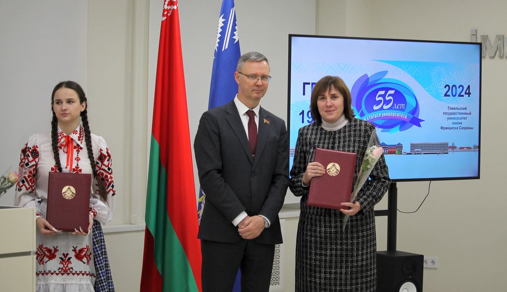 В Гомельском государственном университете имени Франциска Скорины прошло торжественное заседание совета университета, приуроченное к 55-летию со дня преобразования Гомельского государственного педагогического института имени В.П. Чкалова в Гомельский государственный университет. В ходе заседания состоялось торжественное вручение наград в связи с 55-летием со дня преобразования института в университет.  Студентам и преподавателям университета были вручены свидетельства специального фонда Президента Республики Беларусь по социальной поддержке одаренных учащихся и студентов. Информация о стажировках профессорско-преподавательского состава в 2024 году была представлена проректором по учебной работе Ю.В. Никитюком. Также была обсуждена тема представления кандидатур студентов на назначение премий председателей Гомельского облисполкома и горисполкома. В завершение заседания, декан геолого-географического факультета Светлана Андрушко представила информацию об открытии на факультете новой специальности «Туризм и гостеприимство» (квалификация – специалист).