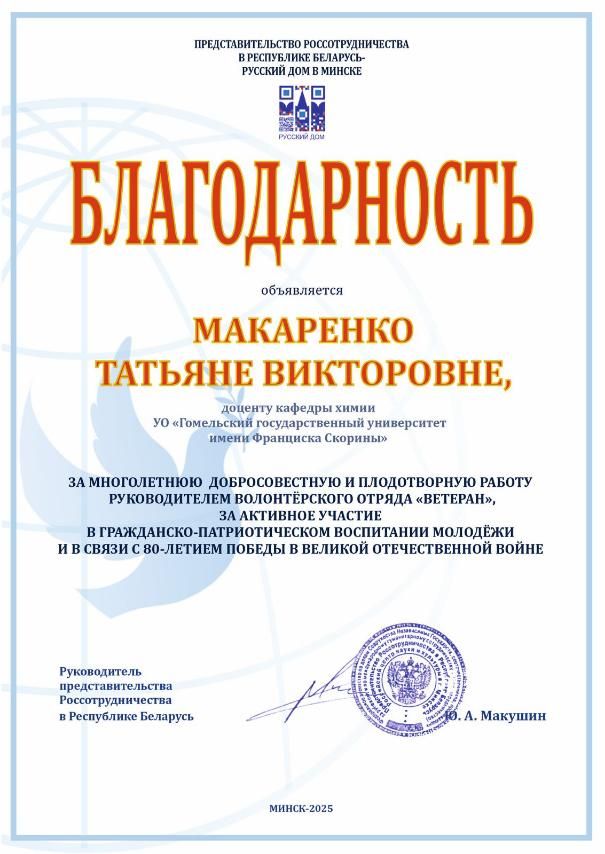 Татьяна Викторовна Макаренко награждена благодарностью за многолетнюю добросовестную и плодотворную работу руководителем волонтёрского отряда «Ветеран» и активное участие в гражданско-патриотическом воспитании молодежи.