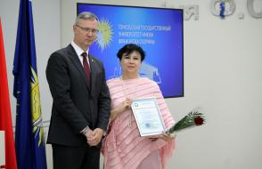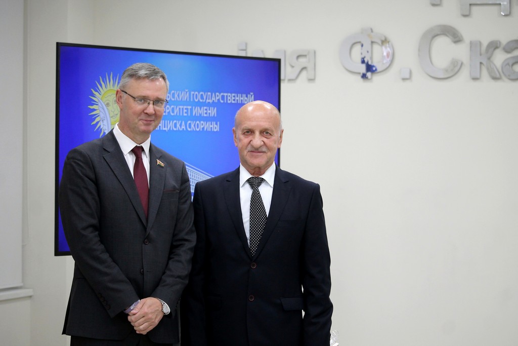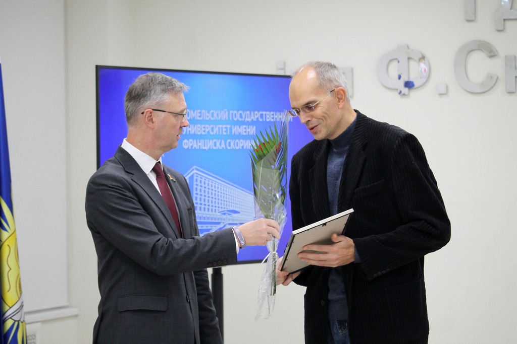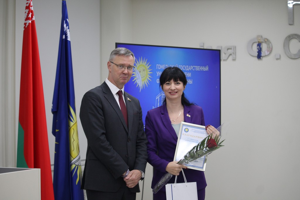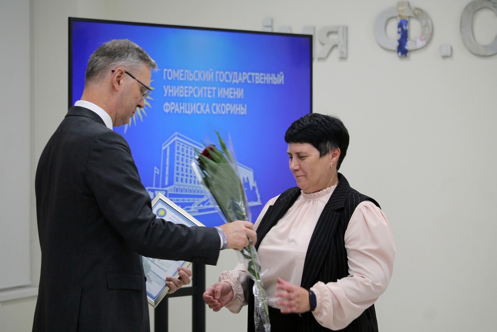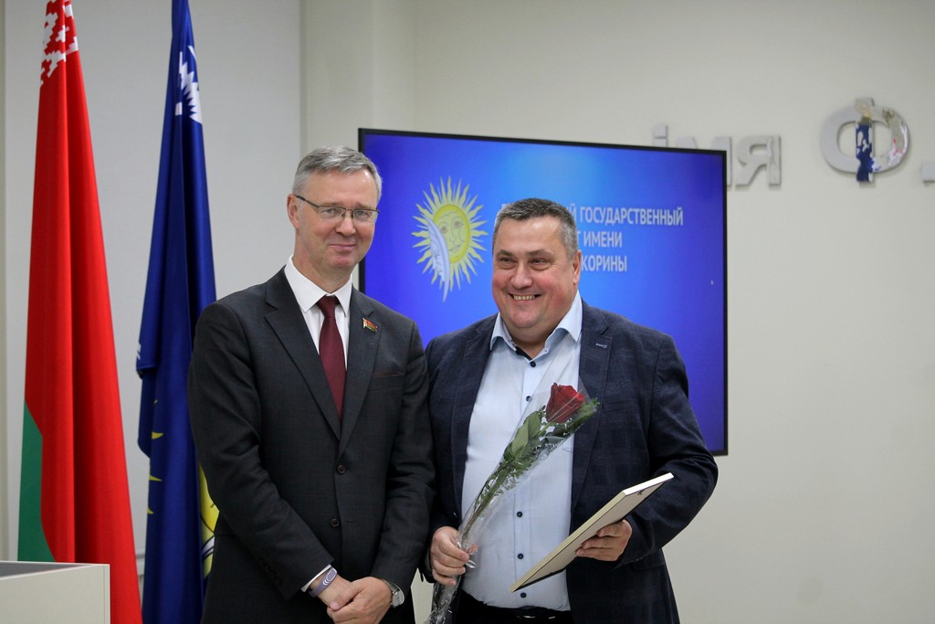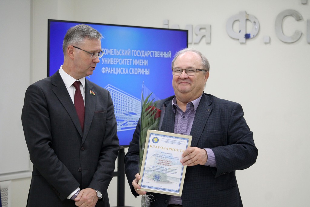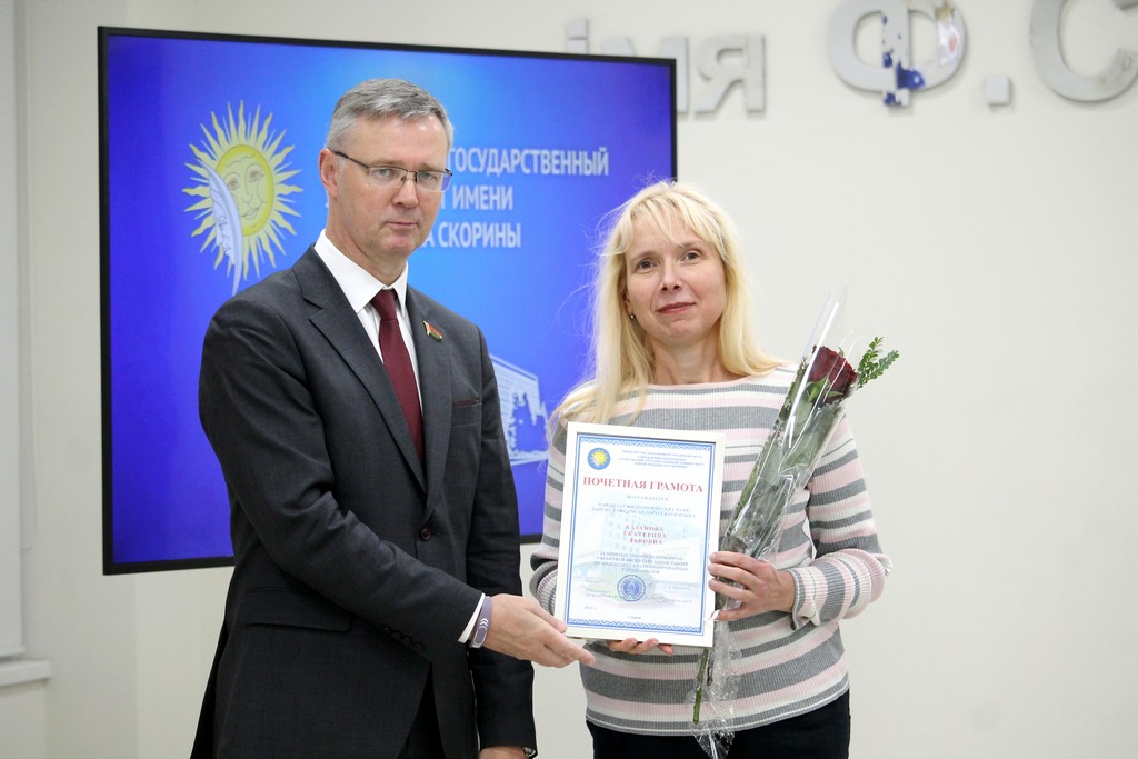 Благодарности Премьер-министра Республики Беларусь «за шматгадовую пленную навукова-педагагiчную дзейнасць, дасягнутыя поспехi ў падрыхтоўцы высокаквалiфiкаваных спецыялiстаў» удостоен профессор кафедры алгебры и геометрии Виктор Монахов. В связи с присвоением ученого звания доцента по специальности «Электроника и наноэлектроника» аттестат доцента вручен доценту кафедры общей физики Сергею Соколову. Почетной грамотой университета за многолетнюю плодотворную учебную и воспитательную работу по подготовке квалифицированных специалистов награждены старший преподаватель кафедры биологии Татьяна Азявчикова, кандидат химических наук, доцент кафедры химии Елена Воробьева, кандидат физико-математических наук, доцент, заведующий кафедрой оптики Владимир Гайшун, кандидат экономических наук, доцент кафедры экономической информатики, учета и коммерции Сергей Говейко, кандидат филологических наук, доцент кафедры белорусского языка Екатерина Хазанова.