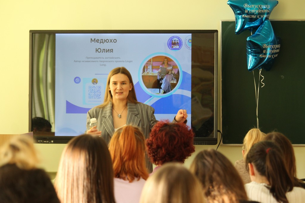 После выступала Юлия Медюхо – выпускница факультета иностранных языков, преподаватель английского высшей квалификационной категории, автор независимого творческого проекта «Linger Long».