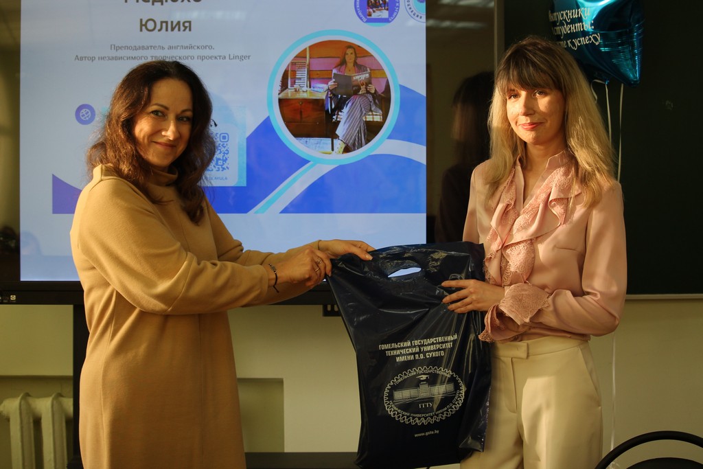 Следующим спикером была Людмила Кулик – выпускница филологического факультета, кандидат филологических наук, доцент, заместитель декана энергетического факультета Гомельского государственного технического университета им. П.О. Сухого.