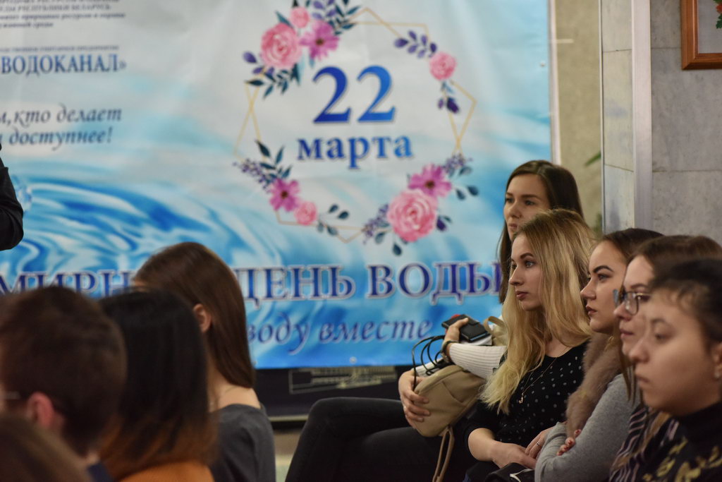 22 марта - асаблівая дата для эколагаў усяго свету. 26 гадоў таму Міжнародная асацыяцыя водазабеспячэння і ЮНЕСКА звярнулі ўвагу грамадскасці на галоўны прыродны рэсурс чалавецтва - прэсную ваду. Стан водных рэсурсаў у Гомельскай вобласці, а таксама пра тое, якімі спосабамі палепшыць экалагічную сітуацыю, студэнты ўніверсітэта высвятлялі разам з намеснікам старшыні і намеснікам начальніка аддзела кантролю за аховай і выкарыстаннем атмасфернага паветра і водных рэсурсаў Гомельскага абласнога камітэта прыродных рэсурсаў і аховы навакольнага асяроддзя Ларысай Сініла і Вадзімам Ткачовым, загадчыкам аддзялення камунальнай гігіены Гомельскага абласнога цэнтра гігіены, эпідэміялогіі і грамадскага здароўя Сяргеем Кравена енко, начальнікам вытворча-тэхнічнага аддзела КВУП "Водаканал" Арцёмам Кацуба, дырэктарам абласнога грамадскага аб'яднання "Гомельская асацыяцыя дзяцей і моладзі" Уладзімірам Коўзелевым і інш.
