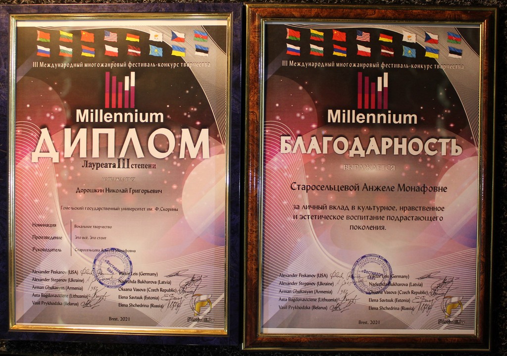 Студэнт факультэта псіхалогіі і педагогікі Гомельскага дзяржуніверсітэта, саліст студэнцкага клуба Мікалай ДАРОШКІН стаў лаўрэатам 3-й ступені III Міжнароднага шматжанравага фестывалю-конкурсу творчасці Millennium. Удзельнікі конкурсу маглі прадэманстраваць сваё майстэрства ў вакальнай, выяўленчай, тэатральнай, інструментальнай і харэаграфічнай творчасці.