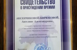 We congratulate Angelina Aksenchikova-Biryukova with a deserved award and wish her good health, creative success, scientific and pedagogical achievements, as well as the achievement of all her goals!