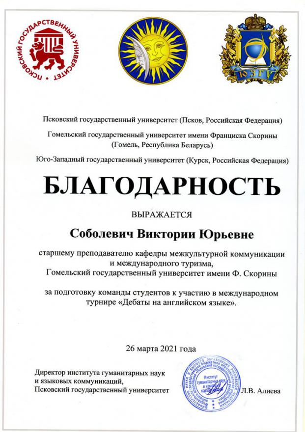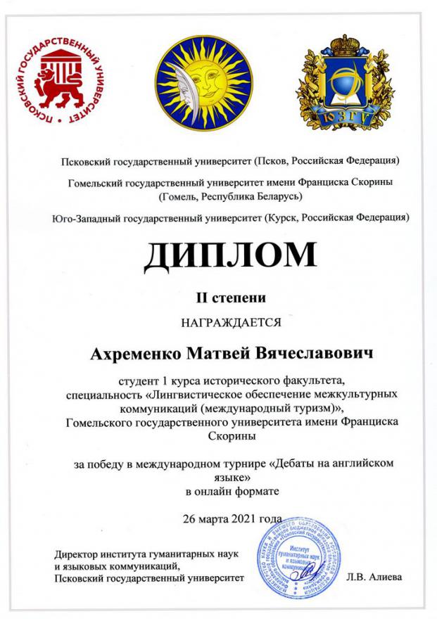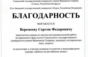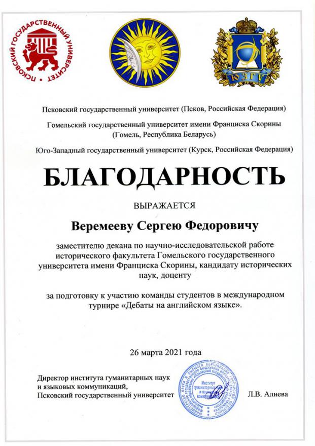 Great help and methodological support in preparation for the participation of our team in international debates was provided by Sergey Fedorovich Veremeyev, Deputy Dean for Research of the Faculty of History, Candidate of Historical Sciences, Associate Professor.