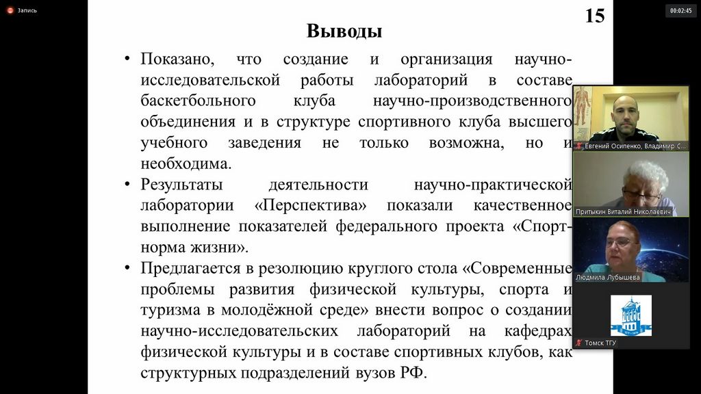 The speakers from the Russian Federation were venerable scientists of the field of physical culture: Irina Manzhelej (Doctor of Pedagogical Sciences, Professor (Tyumen State University, Tyumen)) - "Project physical culture and sports activity of students"; Zhanna Safonova (Doctor of Pedagogical Sciences, Professor (Omsk State Technical University, Omsk)) - "Assessment of the content of physical education of students in the context of mastering the requirements of modern educational standards"; Leonid Dvorkin (Doctor of Pedagogical Sciences, Professor (Kuban State University of Physical Culture, Sports and Tourism, Krasnodar)) - "Physical training of female students of a specialized university based on strength fitness"; Nikolaj Astaf'ev (Doctor of Pedagogical Sciences, Professor (Tyumen Institute of Advanced Training of the Ministry of Internal Affairs of Russia, Tyumen)) - "Assessment of the knowledge of the rules of shooting and the ability to apply them in young biathletes"; Natalia Dvorkina (Doctor of Pedagogical Sciences, Professor (Kuban State University of Physical Culture, Sports and Tourism, Krasnodar)) - "The effectiveness of interval training in the process of physical education of middle school students"; Olga Lomakina (Association of Student Sports Clubs of Russia, Moscow) – "Student sports clubs as a tool for the development of student sports in the Russian Federation"; Tat'jana Kravchuk (Candidate of Pedagogical Sciences, Professor (Siberian State University of Physical Culture and Sports, Omsk)) - "Modern aspects of personnel training in the field of physical culture and sports, taking into account trends in the development of the industry"; Vitaly Pritikin (Candidate of Pedagogical Sciences, Associate Professor (Omsk State University named after F. M. Dostoevsky, Omsk)) - "Scientific support of the activities of sports clubs in universities of the Russian Federation"; Elena Starkova (Candidate of Pedagogical Sciences, Associate Professor, Dean of the Faculty of Physical Culture (Perm State Humanitarian Pedagogical University, Perm)) - "Problems of development of physical culture, sports and tourism in Perm State Humanitarian Pedagogical University"; Evgeny Kolunin (Candidate of Biological Sciences, Associate Professor, Director of the Tyumen State University (Tyumen)) - "Causes and prevention of injuries in qualified athletes" and others.