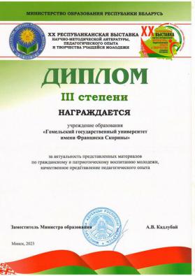 По результатам работы выставки Гомельский госуниверситет был отмечен дипломом ІІІ степени за актуальность представленных материалов по гражданскому и патриотическому воспитанию молодежи и качественное представление педагогического опыта.
