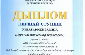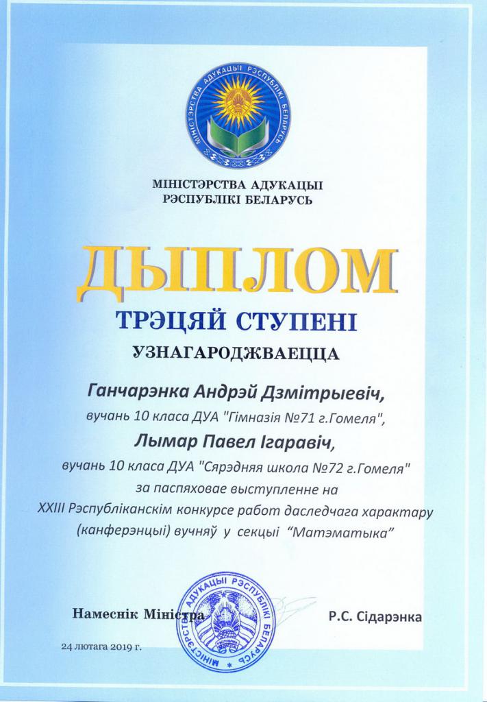 Дыплом другой ступені ўзнагароджаны навучэнец гімназіі №56 г. Гомеля імя А.А. Вішнеўскага Дзмітрый Будзько за працу «Лікі Фібаначы і плошчу шматкутнікаў» (навуковы кіраўнік - прафесар кафедры фінансаў і крэдыту ГДУ імя Ф. Скарыны, доктар фізіка-матэматычных навук, прафесар С.Ф. Каморнікаў).