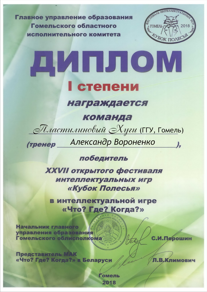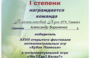 15-16 сентября в Гомеле состоялся старейший турнир Республики Беларусь по интеллектуальным играм – 27-й "Кубок Полесья". За всю его историю победителями в главной номинации – игре "Что? Где? Когда" становились лучшие команды не только нашей страны, но и России и Украины. В этом году в "Что? Где? Когда?" победила гомельская команда, в которой отличился старший преподаватель кафедры политологии и социологии юридического факультета ГГУ Александр Вороненко. Хочется отметить, что подавляющее большинство игроков команды окончили наш университет!