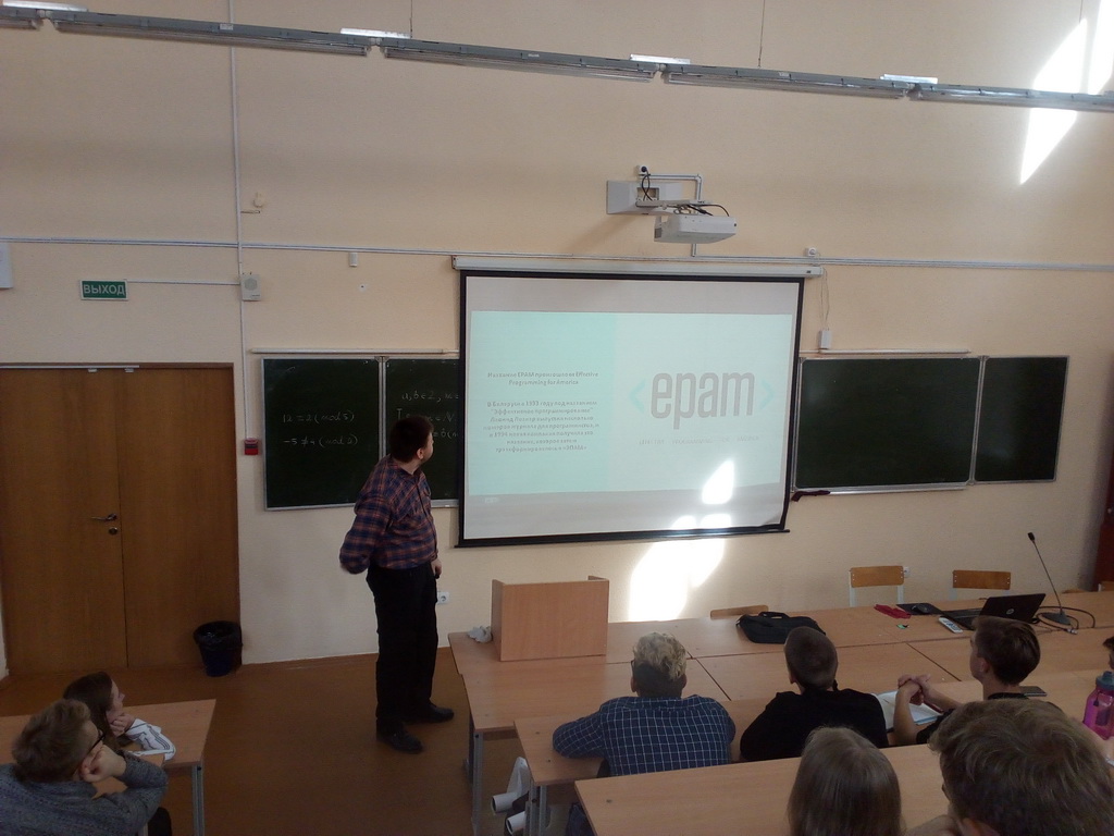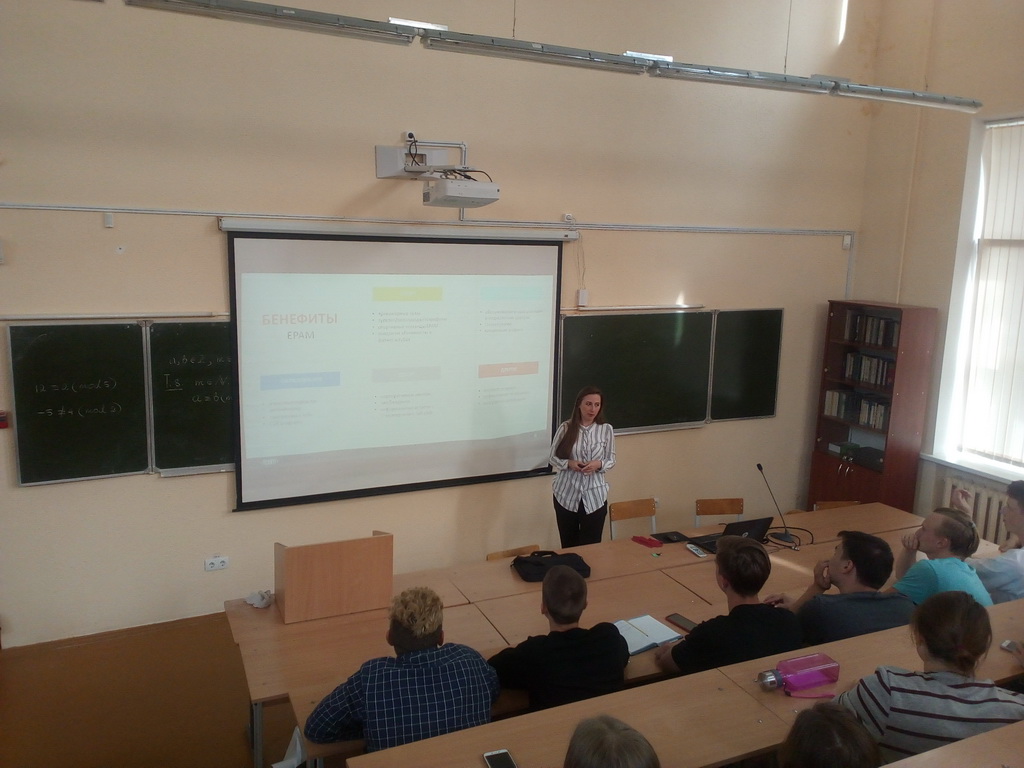 О работе в компании «ЭПАМ Системз», перспективах её развития, возможности трудоустройства в компанию, современных направлениях развития IT-отрасли со студентами беседовали ведущие специалисты «ЭПАМ Системз»: Сергей Николаевич Гуд, менеджер по подготовке кадров, Александр Антоненко, руководитель отдела C# .Net-разработки, Никита Королёв, старший инженер-программист, Java-разработчик, Виктория Дербенёва, менеджер по подбору персонала.