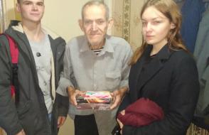 «Угощение для пожилого человека». В ходе благотворительной акции студенты купили пожилым людям конфеты, которые вместе с открытками сами же торжественно вручили в праздничный день.