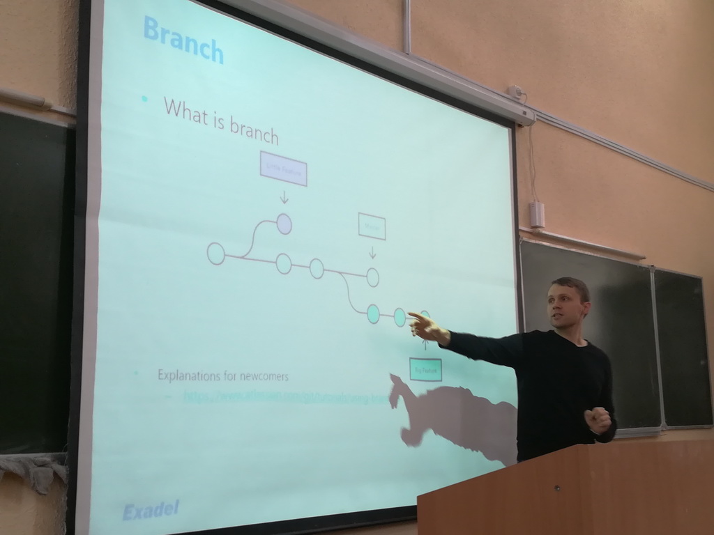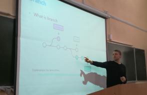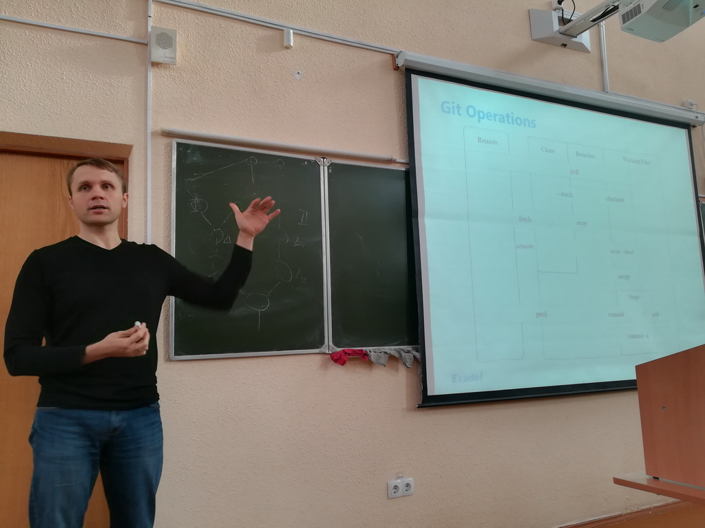 3 ноября прошел очередной четвертый семинар на тему «Инструменты и системы контроля версий (Version Control with GIT)». Он был посвящен рассмотрению технологии Git - не единственной, но очень популярной системы контроля версий (регистрирует изменения в файлах с возможностью отката). Git является важнейшим инструментом работы программистов, разработчиков современного программного обеспечения. Проводил семинар руководитель отдела разработки программного обеспечения компании Exadel Сергей Деруго (г. Минск). Отметим, что Сергей, являясь «кадровым» математиком-программистом (окончил математическое отделение Лицея БГУ и факультет прикладной математики и информатики БГУ), активно занимается преподавательской деятельностью, постоянно читает лекции в БГУ и периодически выступает с докладами для студентов других университетов.