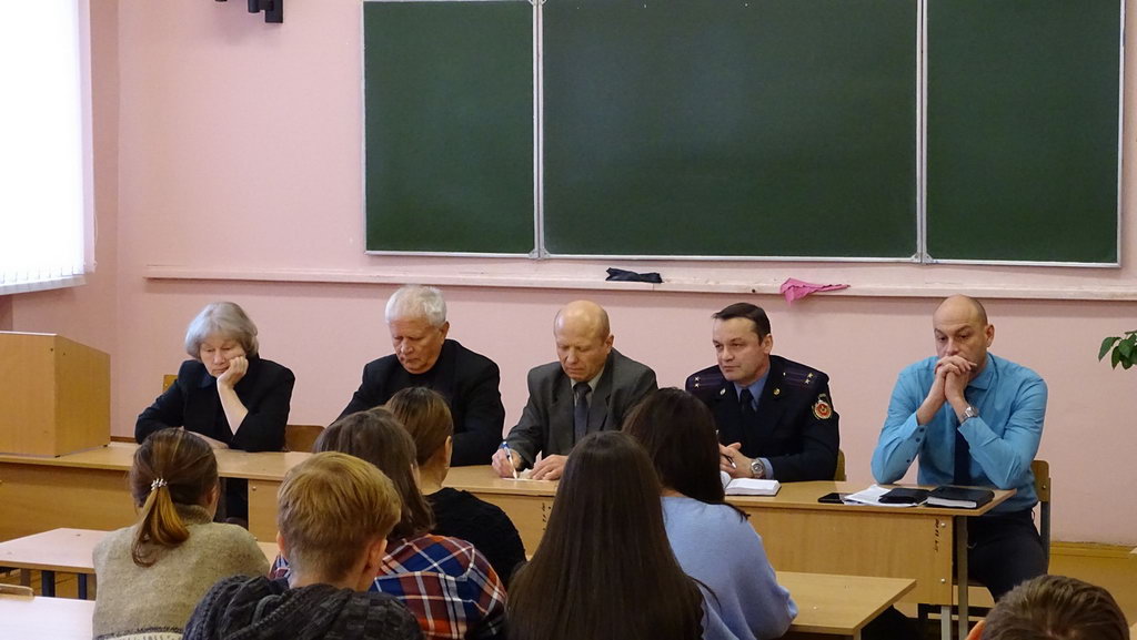 28 ноября на юридическом факультете нашего университета прошла встреча с ветеранами органов внутренних дел и действующими сотрудниками правоохранительных систем, которая имела большое познавательное значение для студентов. На ней присутствовали: полковник милиции в отставке (ранее – начальник криминальной милиции ОВД администрации Центрального района г. Гомеля) Михаил Константинович Воронков; полковник милиции в отставке (ранее – начальник Управления по Гомельской области Главного управления оперативно-розыскной деятельности МВД Республики Беларусь) Виктор Михайлович Домненко; подполковник юстиции (ранее – старший следователь по особо важным делам) Людмила Александровна Понамарижкина.