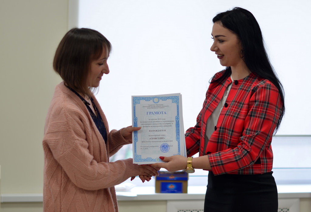 В официальном документе «Информация Гомельского областного отделения Белорусского детского фонда об итогах проведения новогодней благотворительной акции «Наши сердца – больным детям» от 4 декабря 1998 года было отмечено, что при кафедре философии ГГУ имени Ф. Скорины совместно с областным отделением детского фонда создано студенческое общество «Друг детей» с отделениями на историческом, экономическом, физическом факультетах и факультете иностранных языков. Именно на основании этого документа, волонтерское движение университета в декабре 2018 года празднует 20-летний Юбилей.