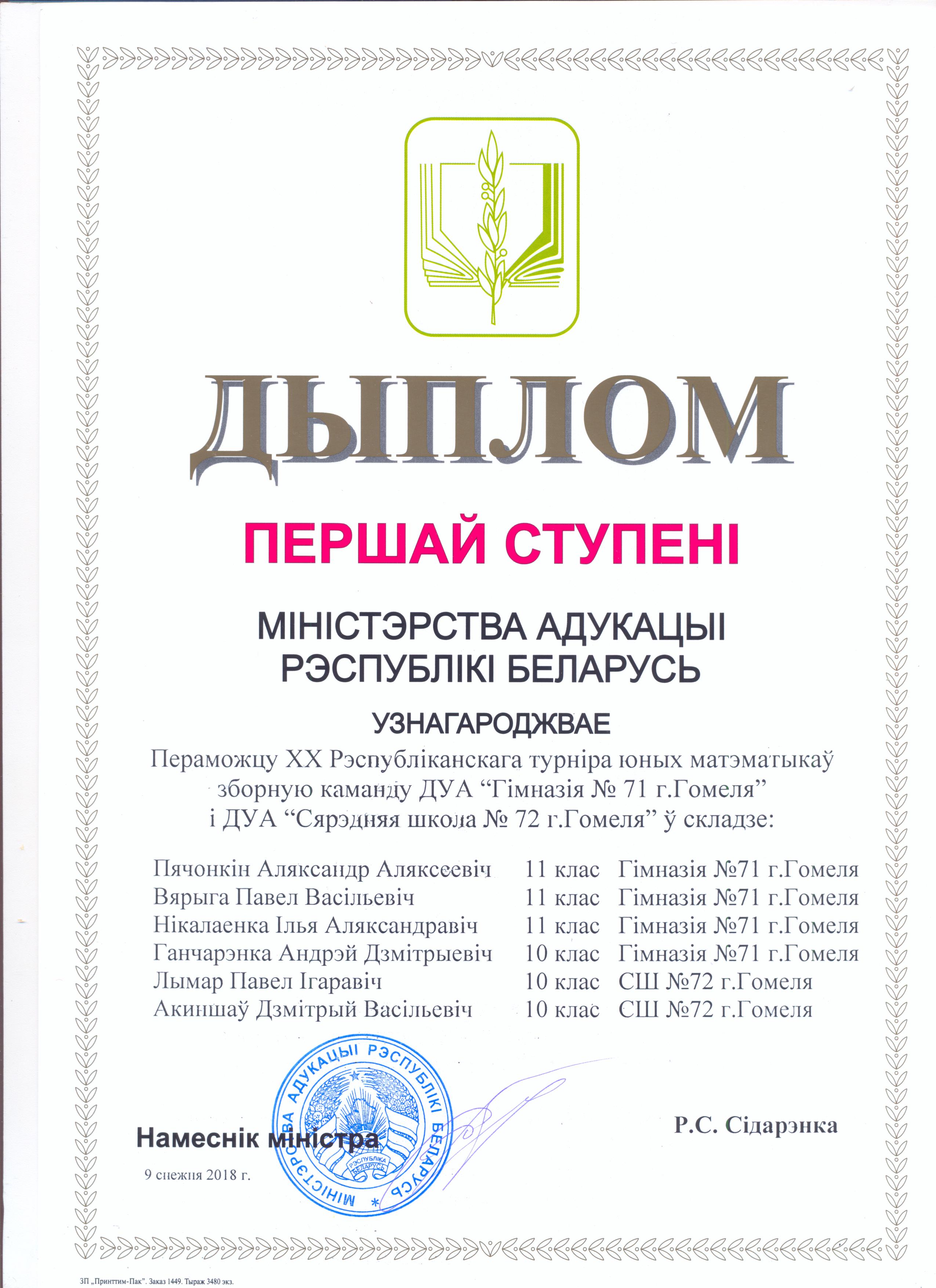 Прошлая неделя была очень плодотворной для юных математиков из Гомеля. Сборная команда Гомель-1 в составе Александра Печенкина, Павла Вериго,  Ильи Николаенко, Андрея Гончаренко(учащихся XI  и X класса ГУО «Гимназия №71 г. Гомеля»), Павла Лымаря и Дмитрия Акиншева (учащиеся X класса ГУО «Средняя школа №72 г. Гомеля») завоевала абсолютное первое место и диплом I степени на XХ Республиканском турнире юных математиков, который прошел в столичной гимназии-колледже искусств имени И.О. Ахремчика 4-9 декабря.
