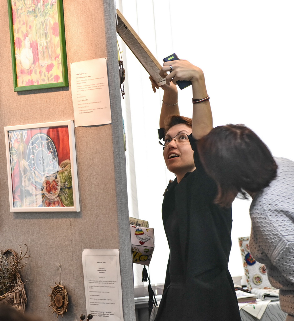 Остальные посетители могли насладиться просмотром выставочной экспозиции, где были представлены работы мастеров, разных творческих направлений и техник. Александра Звягина, мастер росписи по ткани, представила свои работы в технике батик. Утонченные современные украшения, выполненные в технике кольчужного плетения, представила мастер Наталья Шенец. Невероятные по креативу и характеру головные уборы Ольги Шулико вызывали у любого, кто подходил к ее стенду, желание примерить шляпку или шапочку. Гармонично дополнял выставку шляпок стенд, на котором были представлены шелковые шарфы и платочки с росписью Ирины Федоровой. А выставка кукол Анны Гонарт и декоративных подушек-игрушек Инны Михолап имела успех не только у взрослых, но и у самых юных посетителей выставки. А они являются самыми искренними ценителями любого искусства.