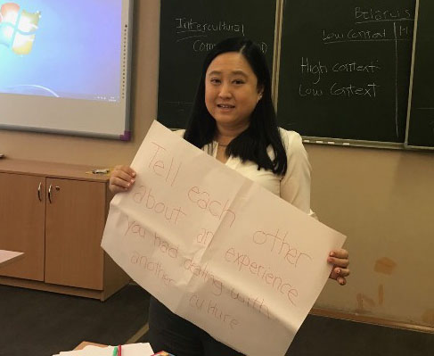Занятия проходили в двух группах, для которых преподаватели МГЛУ провели образовательные мероприятия в разных форматах. В программе также участвовала и носитель языка – американская коллега Хан Кристин, старший преподаватель кафедры последипломного языкового образования МГЛУ, которая провела англоязычный мастер-класс по использованию информационно-коммуникационных технологий в процессе обучения иностранному языку, а также семинар по аспектам межкультурной коммуникации.