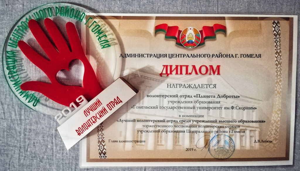 В первый день февраля в СШ №27 г. Гомеля состоялся торжественный прием волонтеров учреждений образования Центрального района г. Гомеля. Волонтерский отряд геолого-географического факультета «Планета доброты» получил диплом и статуэтку в номинации "Лучший волонтерский отряд среди учреждений высшего образования".