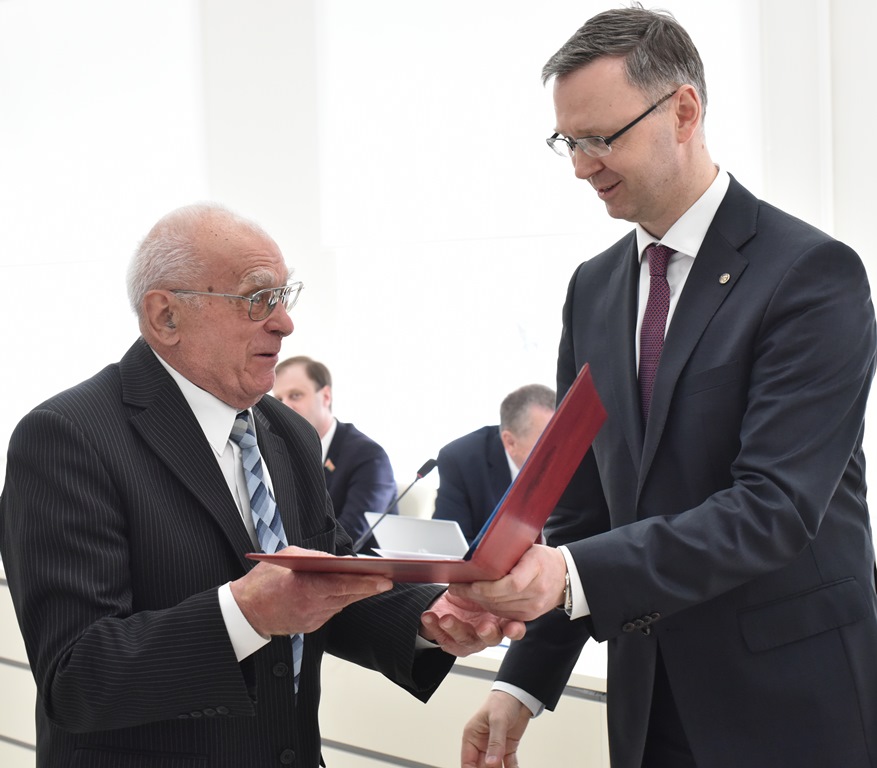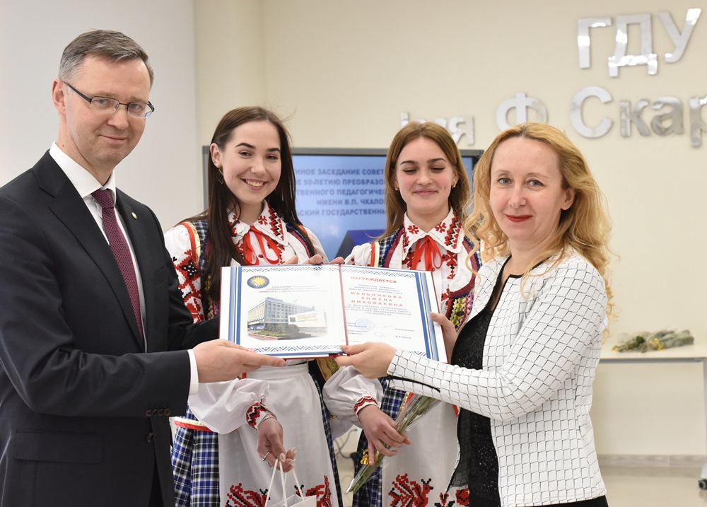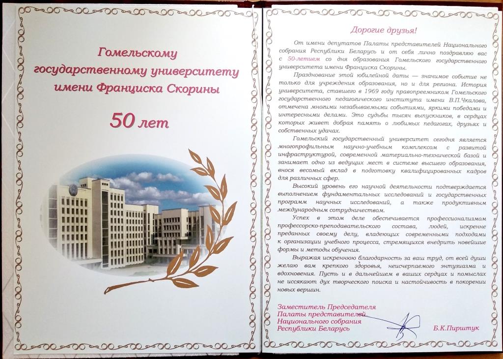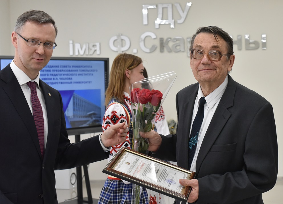 За многолетний плодотворный и творческий труд, значительный личный вклад в подготовку высококвалифицированных специалистов и в связи с 50-летием со дня преобразования Гомельского пединститута имени В.П. Чкалова в Гомельский государственный университет были награждены: