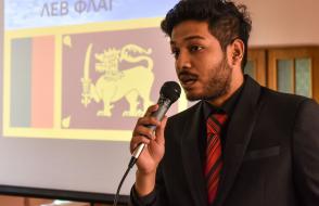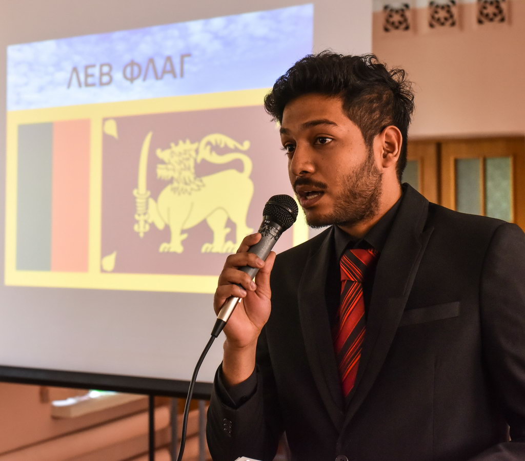 О родной стране Шри-Ланка рассказал харизматичный парень Лиянаараччи Дамиду Вибава. Стихотворение Михаила Исаковского «Враги сожгли родную хату», написанные в 1945 году, прочли Захаран Доле Баба и Мухаммед Назардин. А национальная песня, исполненная парнями с восточным колоритом, просто взорвала зал яркими эмоциями!