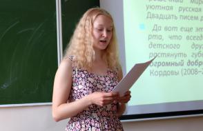 1. Анастасия Елынцева, студентка 2 курса факультета иностранных языков. Тема доклада: «Британский и американский варианты английского языка: особенности использования в учебном процессе» (научный руководитель: преподаватель кафедры теории и практики английского языка Екатерина Анатольевна Окунева);
