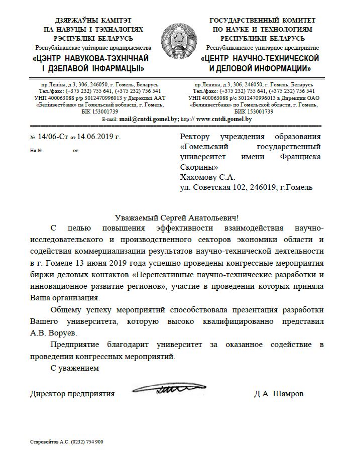 13 июня в Гомеле прошли конгрессные мероприятия биржи деловых контактов «Перспективные научно-технические разработки и инновационное развитие регионов». Целью их проведения стало повышение эффективности взаимодействия научно-исследовательского и производственного секторов экономики региона, содействие коммерциализации результатов научно-технической деятельности.