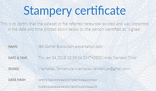 Представитель компании ООО «ИВА-Гомель-Парк» Вячеслав Семенюта рассказал о высоком потенциале технологии на базе уже действующих проектов "Dubai Land Registry", "Estonia e-Residency card", совместный проект IBM Corporation и Walmart Inc. по отслеживанию пути пищевых продуктов “от грядки до полки”. Еще одним перспективным направлением применения технологии блокчейн является защита авторского права на интеллектуальную собственность.