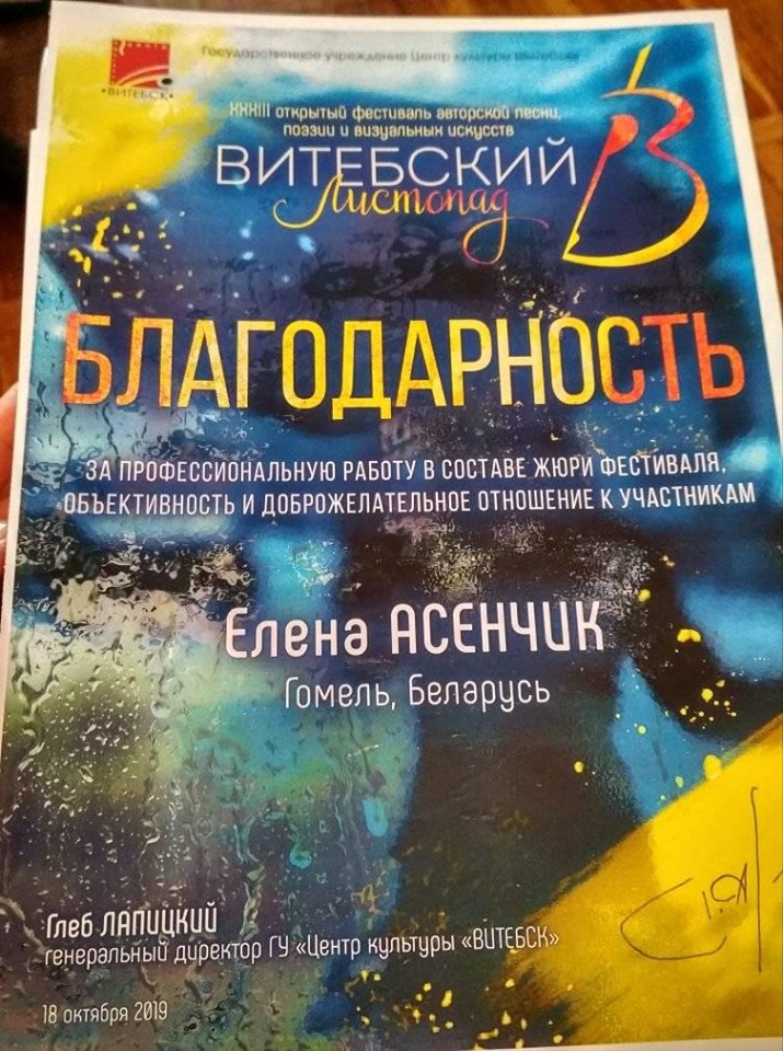 В жюри конкурса (в номинациях «Поэзия. Свободная тематика» и «Поэзия. Стихи для детей») была включена преподаватель кафедры русского, общего и славянского языкознания Елена Асенчик. Сначала (на заочном этапе конкурса в августе) среди многочисленных конкурсантов она выбирала финалистов в номинации «Поэзия» для их дальнейшего участия в фестивале. Затем уже непосредственно в Витебске в течение трёх дней (с 18 по 20 октября) принимала участие в многочисленных мероприятиях фестиваля: в выборе победителей среди поэтов-финалистов, читавших свои стихи с одной из сцен творческого форума; в презентации гомельского журнала «Метаморфозы» (главный редактор Наталья Сляднева), оказывающего информационную поддержку фестивалю и предоставившего возможность призовой публикации самым интересным авторам в номинации «Стихи для детей», а также приз симпатий победителю турнира поэтов; в заключительном поэтическом концерте «Сквозная линия».