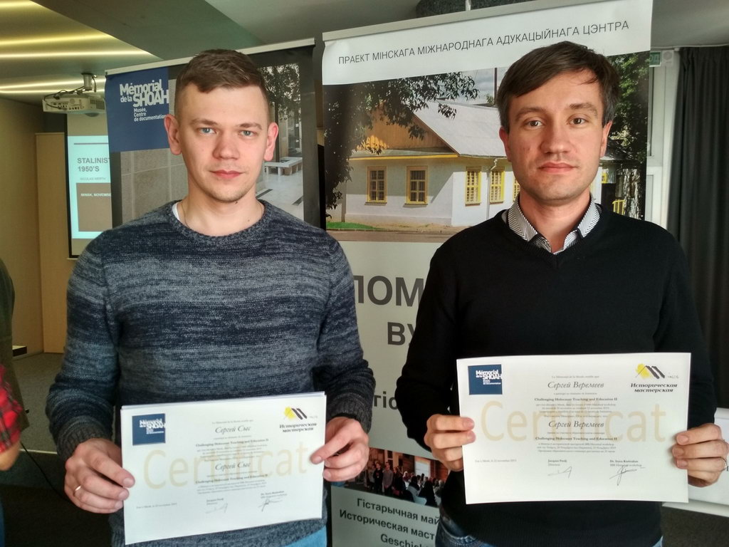 Доцент кафедры истории славян и специальных исторических дисциплин Сергей Веремеев и заместитель начальника отдела международных связей ГГУ им. Ф.Скорины старший преподаватель кафедры уголовного права и процесса Сергей Сыс приняли участие в образовательном семинаре для преподавателей истории и сотрудников музеев по теме «Проблемы преподавания истории Холокоста и Второй мировой войны в Беларуси», который проходил 20-22 ноября 2019 г. в Минском международном образовательном центре имени Йоханнеса Рау. Мероприятие было организовано и проводилось Исторической мастерской имени Леонида Левина совместно с Мемориалом де ля Шоа (Memorial de la Shoah, Франция). На семинаре были представлены методики преподавания темы Холокоста в образовательных учреждениях, а также результаты исследований известных белорусских, российских и французских специалистов по истории Второй мировой войны, нацистского оккупационного режима на территории Беларуси, антисемитизма. Среди выступавших был известный французский историк и советолог профессор Николя Верт. Была также организована экскурсия по бывшей территории Минского гетто. По итогам работы семинара участники получили сертификаты.