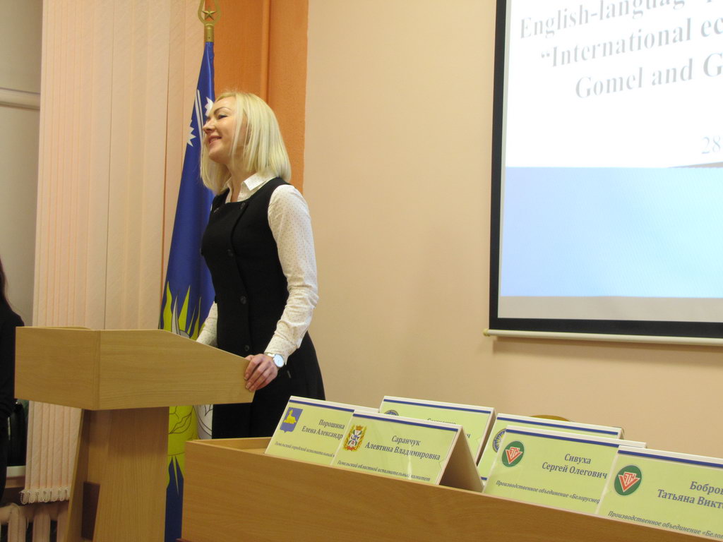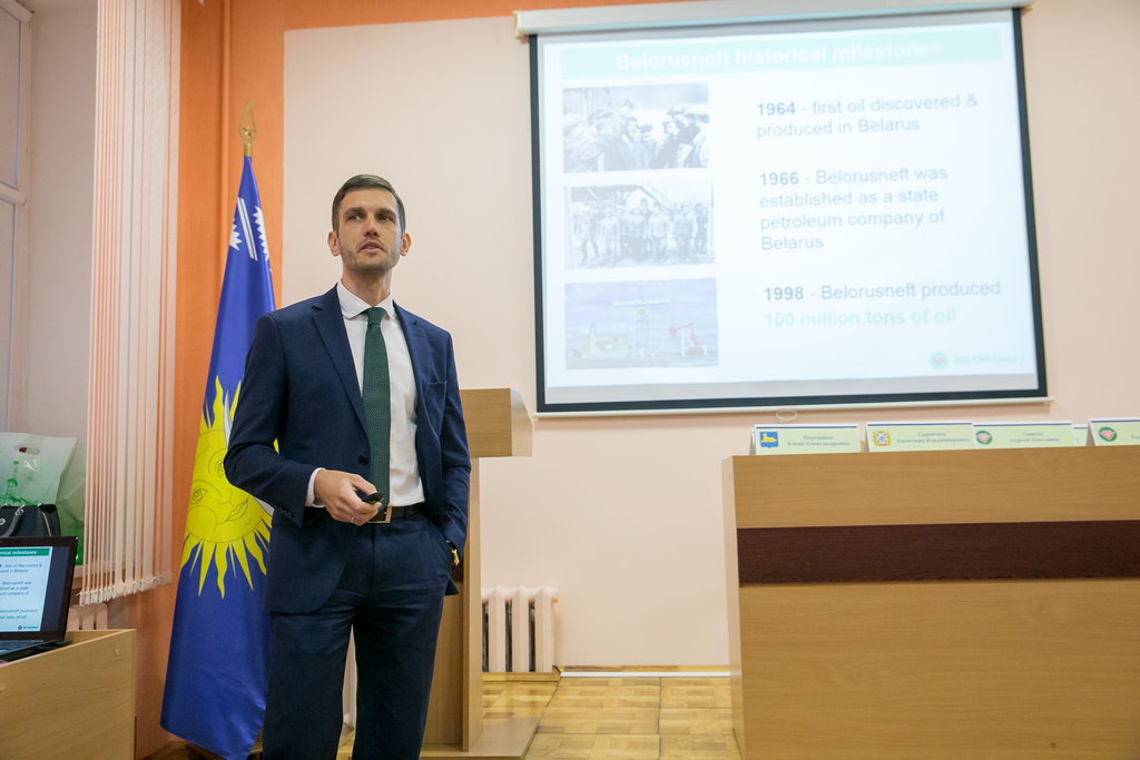 Среди почетных гостей — заместитель начальника управления образования Гомельского горисполкома Елена Порошина и начальник управления внешнеэкономических связей комитета экономики Гомельского облисполкома Алевтина Саранчук. С тематическими докладами на английском языке перед студентами и преподавателями экономического факультета и факультета математики и технологий программирования, учащимися средней школы № 72 выступили представители крупнейших промышленных предприятий. О деятельности производственного объединения «Белоруснефть» рассказали руководитель группы протокольно-организационной работы управления ВЭД Центрального аппарата Сергей Сивуха, специалист отдела переработки и реализации нефтепродуктов на внутреннем рынке Татьяна Боброва и ведущий инженер отдела внешнего сервиса по строительству и ремонту скважин Константин Алексеев.