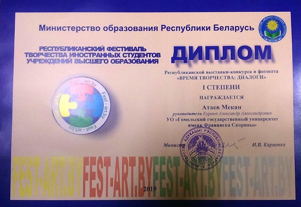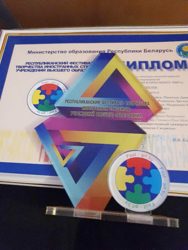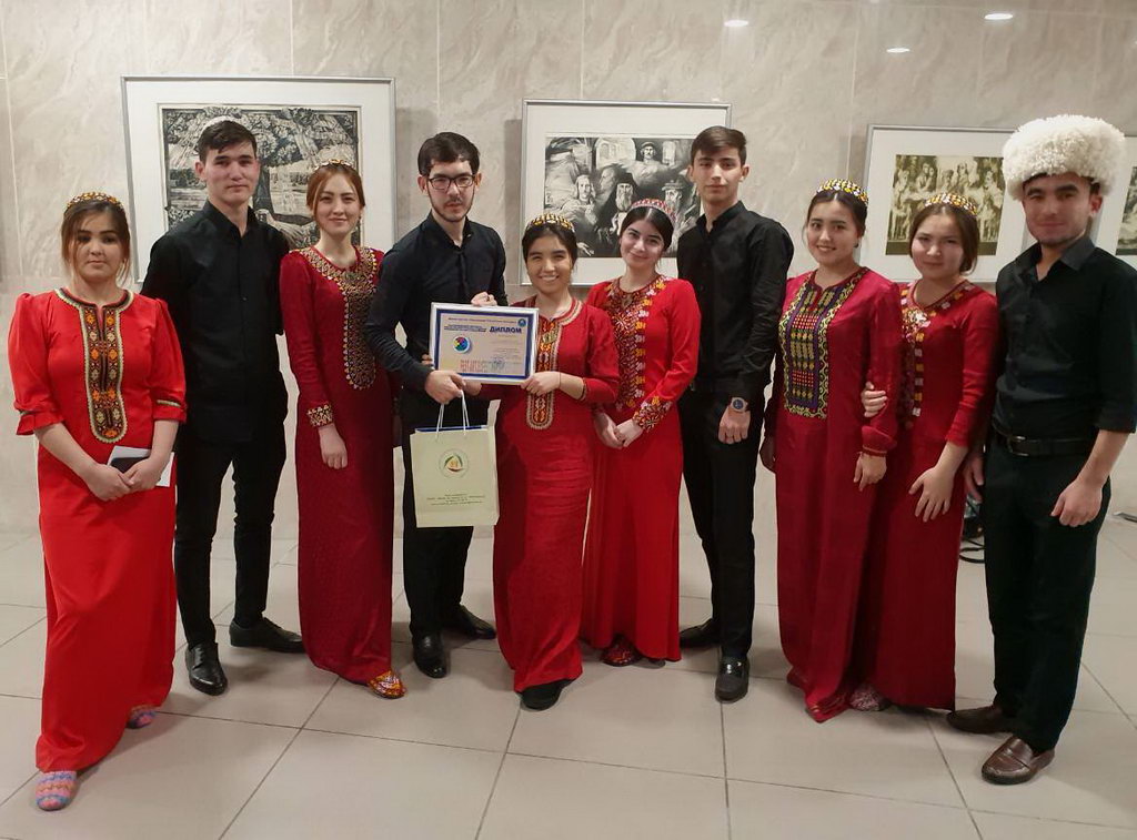 Под эгидой Министерства образования Республики Беларусь в Минске прошёл Республиканский фестиваль творчества иностранных студентов учреждений высшего образования Fest-art.by, в котором приняли участие туркменские студенты Гомельского государственного университета имени Франциска Скорины. Диплом I степени за победу в Республиканском конкурсе видеоматериалов и арт-мероприятий «Орнаменты стран в орнаменте мира» получили участники ансамбля «Ашхабад», созданного на филологическом факультете, поэтому основа ансамбля – студенты-филологи. Стоит отметить, что сейчас коллектив входит в состав студенческого клуба, а список участников пополняется студентами исторического, геолого-географического, биологического факультетов, а также факультета иностранных языков. Этой победе предшествовала огромная работа по созданию ролика, посвящённого особенностям национального туркменского танца «Куштдепди», входящего в наследие ЮНЕСКО. Идея создания ролика принадлежала старшему преподавателю кафедры русского, общего и славянского языкознания Ирине Сериковой, которая является руководителем ансамбля. Воплотить идею помогли студентка филологического факультета Евгения Толкачёва и студент факультета физики и информационных технологий Илья Головач.
