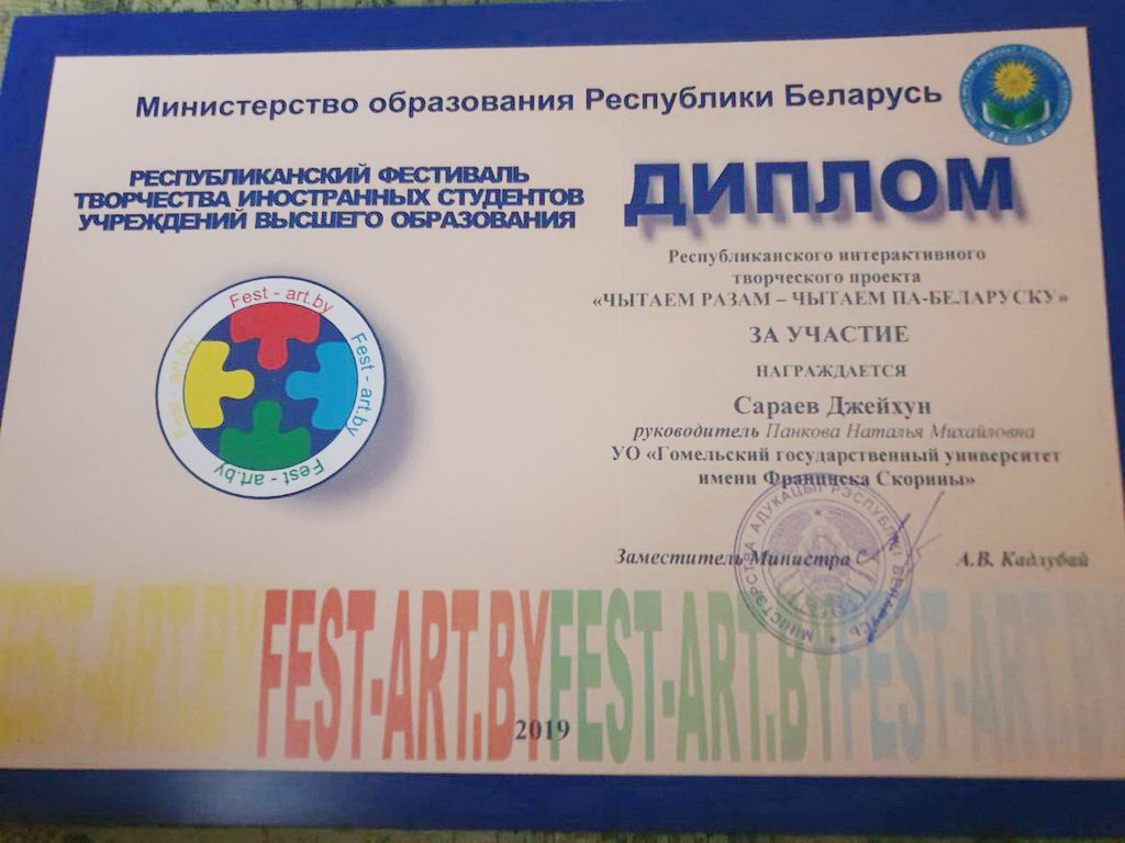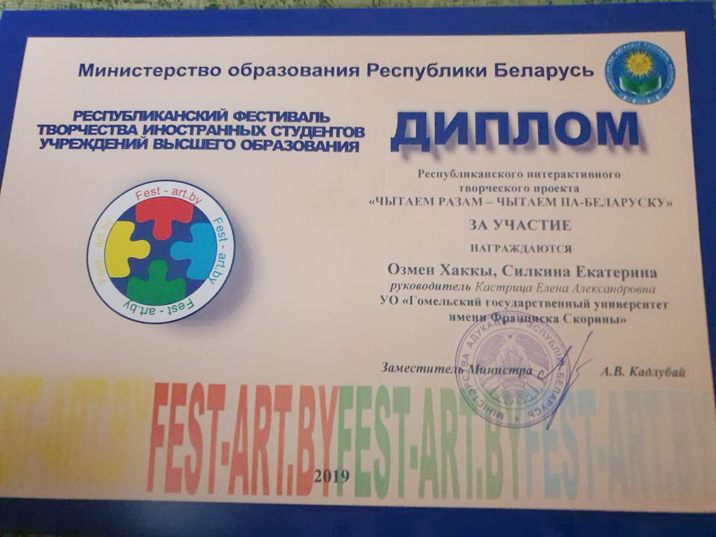 Ко всему прочему дипломами Республиканского интерактивного творческого проекта «ЧЫТАЕМ РАЗАМ – ЧЫТАЕМ ПА-БЕЛАРУСКУ» за участие были награждены Хаккы Озмен и Екатерина Силкина (руководитель Елена Кастрица) и Джейхун Сараев (руководитель Наталья Панкова).