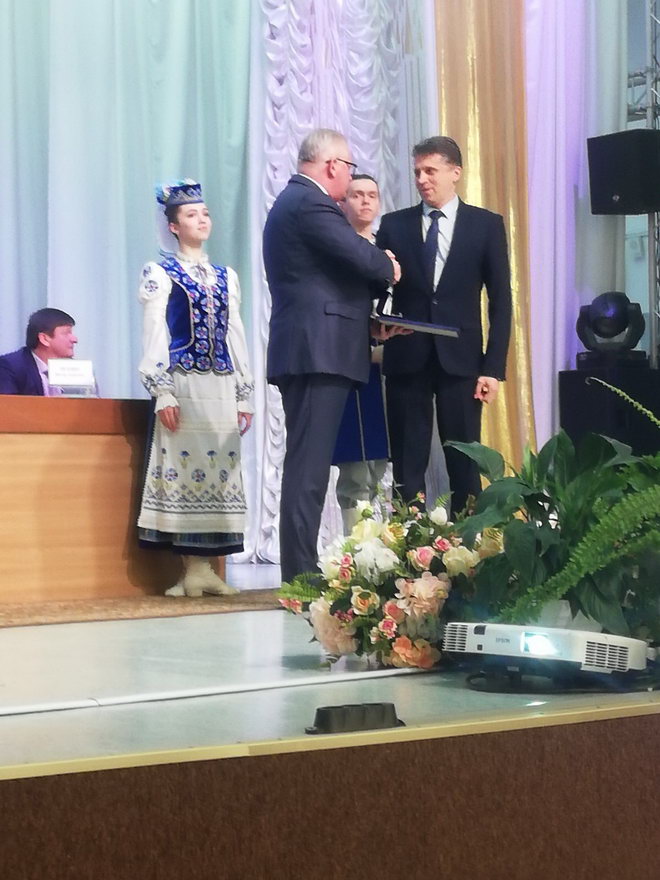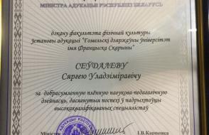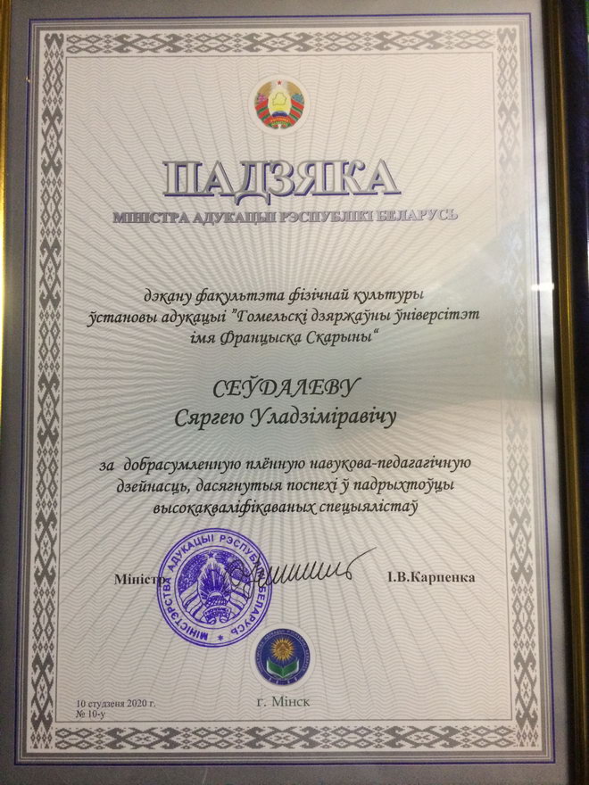 За добросовестную плодотворную научно-педагогическую деятельность, достигнутые успехи в подготовке высококвалифицированных специалистов глава ведомства Игорь Карпенко вручил благодарность декану факультета физической культуры ГГУ имени Ф. Скорины, кандидату педагогических наук, доценту Сергею Севдалеву.