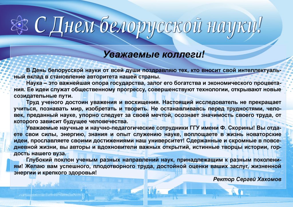 Уважаемые научные и научно-педагогические сотрудники ГГУ имени Ф. Скорины! Вы отдаете свои силы, энергию, знания и опыт служению науке, воплощаете в жизнь новаторские идеи, прославляете своими достижениями наш университет! Сдержанные и скромные в повседневной жизни, вы авторы и вдохновители важных открытий, истинные творцы истории, гордость нашего вуза.