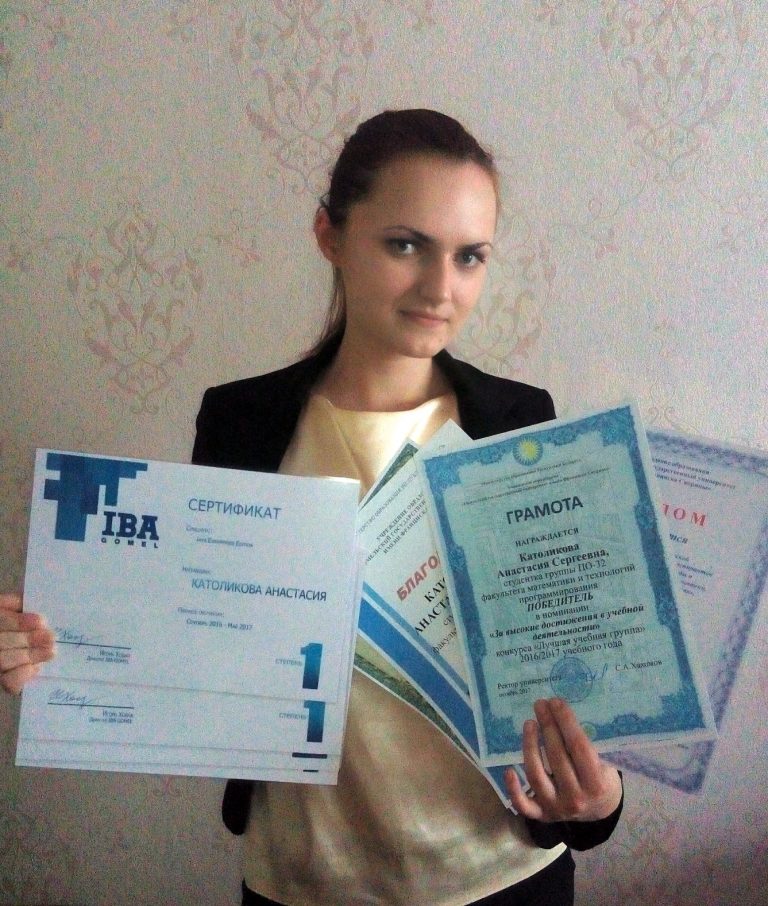 Анастасия постоянно совершенствует свои знания в области программирования. Это подтверждается сертификатами фирмы ИВА по тестированию программного обеспечения, основным языкам программирования и работе с базами данных (Java, DB2, C# и ASP.NET, ERP SAP R/3, Lotus Domino/Notes). За весь период учебы на факультете Анастасия сдавала экзамены, защищала курсовые работы и проекты только на 10 баллов. В числе первых выпускников факультета она получила распределение в «ИВА-Гомель-Парк» — одну из ведущих ИТ-компаний – резидентов Парка Высоких Технологий Республики Беларусь.