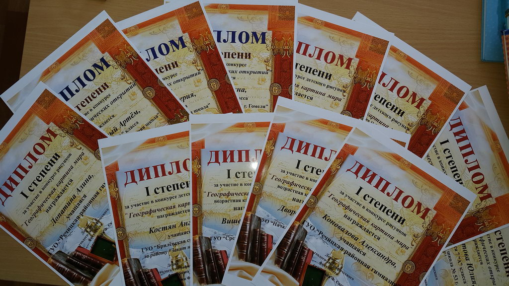 Самые маленькие обладатели дипломов 1 степени – 6-летние Вячеслав Асташин из Нижнего Новгорода и Артем Дворецкий из Гомеля. В средней возрастной категории (8-10 лет) лучшими работами признаны картины Карины Вишенковой (ГУО «Средняя школа № 62 г. Гомеля») и Марии Путро (ЧУО «Средняя школа Стембридж», г. Минск). В старшей возрастной категории победили работы «Закат над озером» Ангелины Костян, учащейся 8 класса ГУО «Брилевская средняя школа» и Александры Лодня, учащейся ГУО «Гомельская Ирининская гимназия».