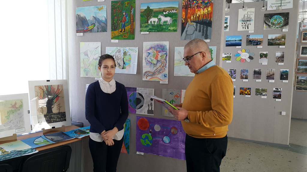 Ежегодную выставку «Посмотри в глаза природе» в этом году украсили детские рисунки, авторы которых приняли участие в конкурсе «Географическая картина мира». Конкурс был организован кафедрой геологии и географии ГГУ имени Ф. Скорины и Гомельским отделом ОО «Белорусское географическое общество» при поддержке Российского центра науки и культуры в Гомеле. Конкурс посвящен любви к природе, своему родному краю, географии. Всего было заявлено 108 работ, наполненных детской легкостью, яркостью и неповторимостью. Самыми маленькими участниками стали дети 5-6 лет. География участников конкурса охватывает две страны: Беларусь и Россию. Были представлены картины юных художников школ Гомеля, Гомельского, Речицкого, Кормянского районов, Минска и Нижнего Новгорода (Российская Федерация).