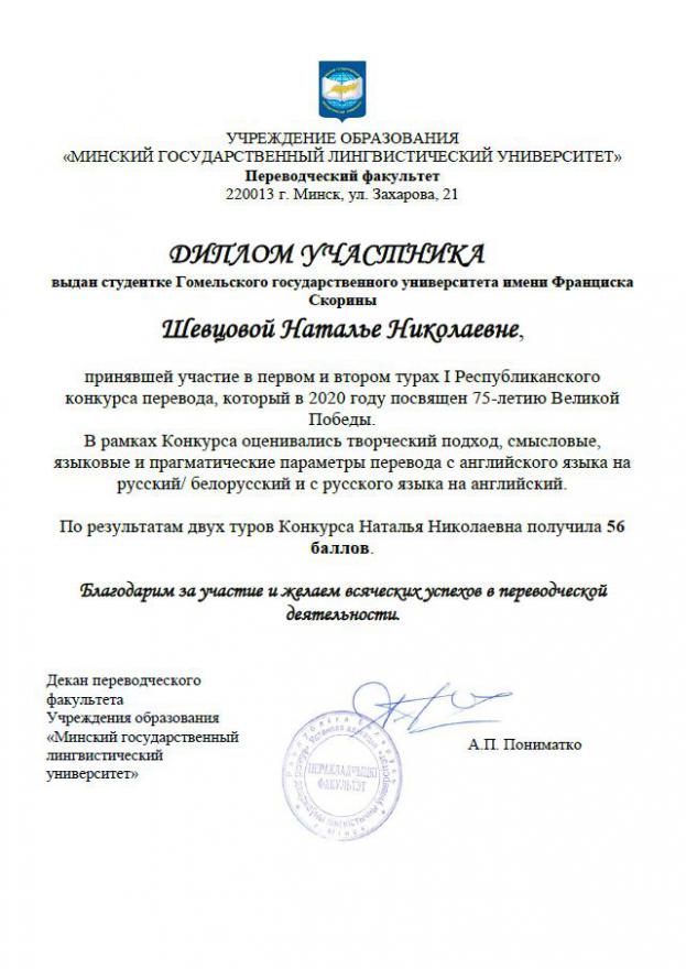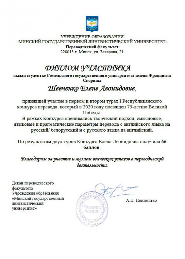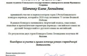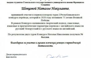 На базе университета МГЛУ проходил I Республиканский конкурс перевода, посвященный празднованию 75-летия Великой Победы. Народы всего мира чтят ветеранов, которые внесли вклад в общее дело – освобождение Родины от фашистских захватчиков. Участникам были предложены две секции: письменный и устный переводы. Студенты 3 курса факультета иностранных языков Елена Шевченко и Наталья Шевцова приняли участие в секции письменного перевода. В первом туре требовалось перевести на выбор художественный или публицистический текст. Студенты выбрали художественные тексты. Это был интересный опыт перевода, показавший сильные и слабые стороны в переводческой деятельности. Задания были выполнены участниками в дистанционном формате.