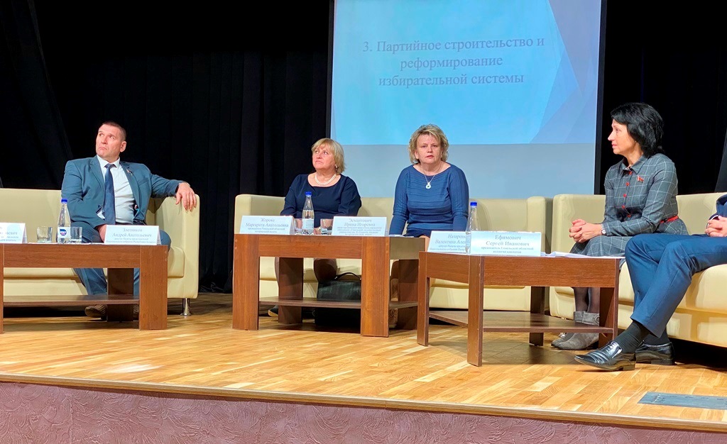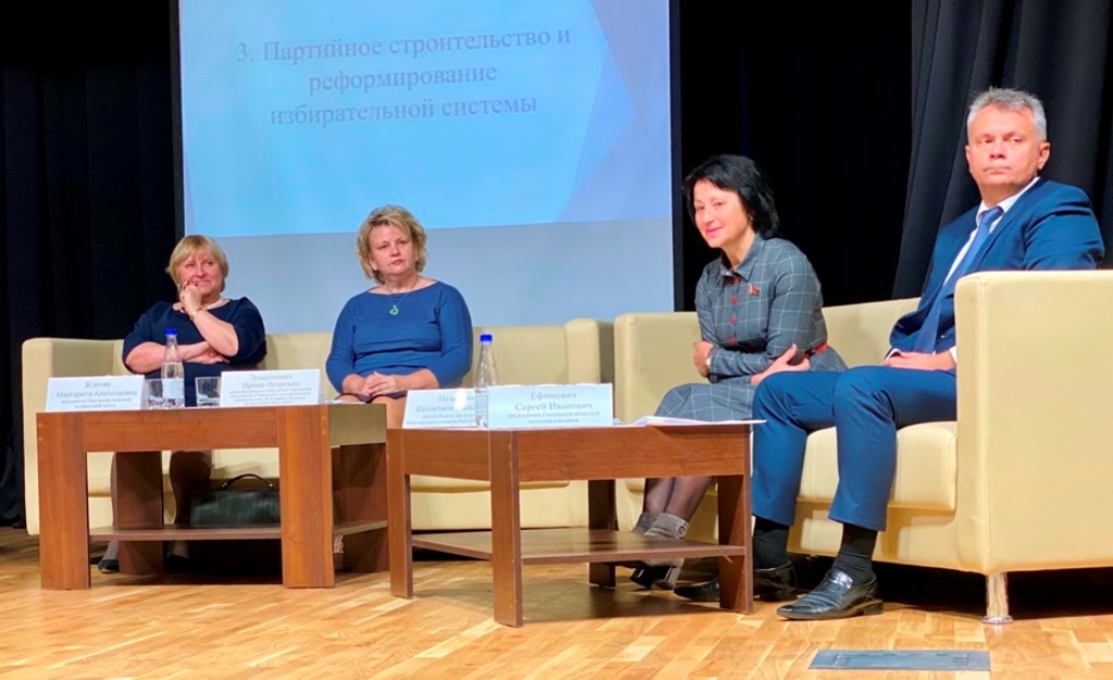 Представители юридического факультета ГГУ в составе декана факультета к.и.н. И.И. Эсмантович, заведующих кафедр (к.ю.н. В.А. Брилёвой, к.полит.н. Е.Г. Абраменко, к.ю.н. Т.В. Сеньковой), доцента кафедры теории и истории государства и права, к.ю.н. А.Э. Набатовой, старшего преподавателя кафедры теории и истории государства и права Ю.И. Ивановой приняли участие в обсуждении актуальных вопросов о внесении изменений и дополнений в Конституцию Республики Беларусь, которая состоялась 12 октября в Мозыре с участием юристов, экономистов, представителей политических партий, а также лидеров общественных организаций, депутатов и жителей региона.