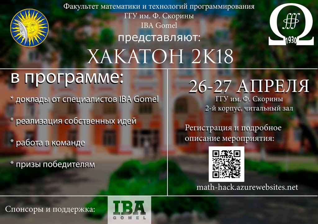 С 26 по 27 апреля на базе факультета математики и технологий программирования ГГУ им. Ф. Скорины совместно с IBA Gomel впервые пройдёт Хакатон для студентов вузов г. Гомеля.