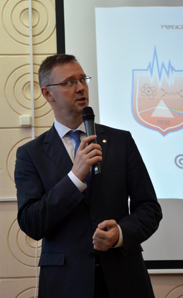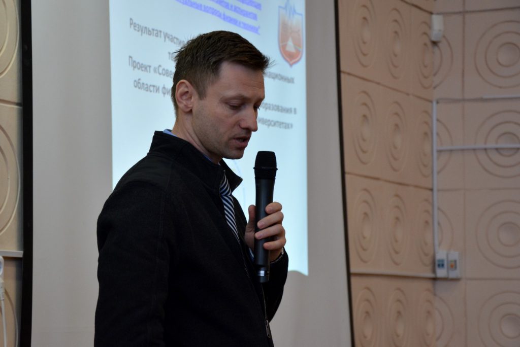 С докладом «Результат  участия  факультета  физики  и  информационных технологий  в  программе Erasmus+» выступил кандидат физико-математических наук, заместитель декана факультета Самофалов Андрей Леонидович. Он рассказал студентам о международных проектах и совместных программах нашего университета с учреждениями образования европейских стран. Его выступление раскрыло для студентов удивительную возможность принять участие в зарубежных стажировках, практикумах, мастер-классах и семинарах.
