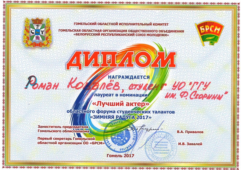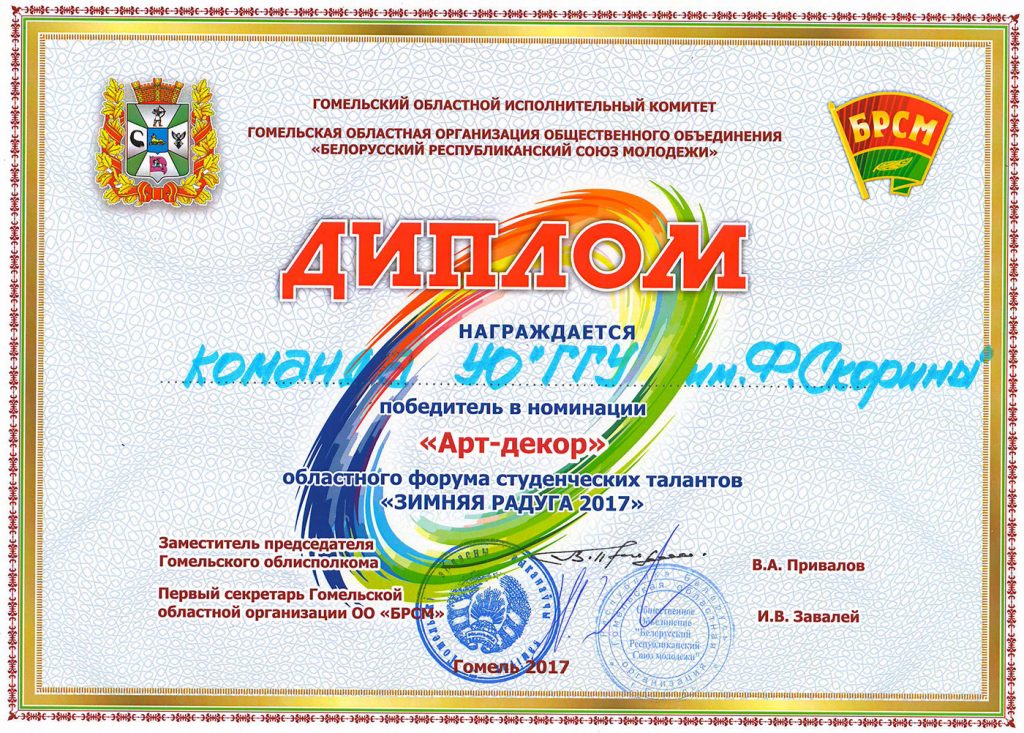 21 декабря в Гомельском областном общественно-культурном центре состоялся фестиваль студенческих талантов «Зимняя радуга 2017». Свои таланты на главной сцене области продемонстрировали представители всех вузов Гомельского региона, которые были признаны лучшими в университетских конкурсах «А ну-ка, первокурсник!».